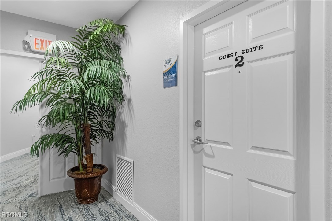 Beautiful Waterside 3 bed, 3 bath condominium that has a panoramic view of a large green nature preserve with lots of bird life and a skyline of beachfront condo on the Gulf of Mexico. You can enjoying sitting on the lanai watching the winter sunset skies and a bright natural ambience! This property is being offered turnkey furnished with tasteful modern furnishings! The kitchen has soft touch cabinetry and beautiful polished granite countertops. The large bay windows are tinted to keep the heat out and no need for curtains. The third bedroom has a queen size murphy bed and built in office space for two! It's the perfect office and spare bedroom. You have storage outside by the packing space and on the 2nd floor for easy convenience. You have one assigned covered parking space. Social room and exercise room are on the first floor. There are also guest suites on the first floor available to rent if the three bedrooms are not enough to handle guests or family. Waterside 1 is the first building as you go through the Guard Gate AC 2025 Electric panel 2024
