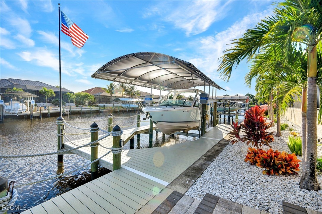 Enjoy breathtaking canal views from the picture-frame lanai screens, relax by the heated pool, or entertain at the built-in grill. A 10,000-lb covered boat lift and composite dock with power offer Gulf access for boating enthusiasts.