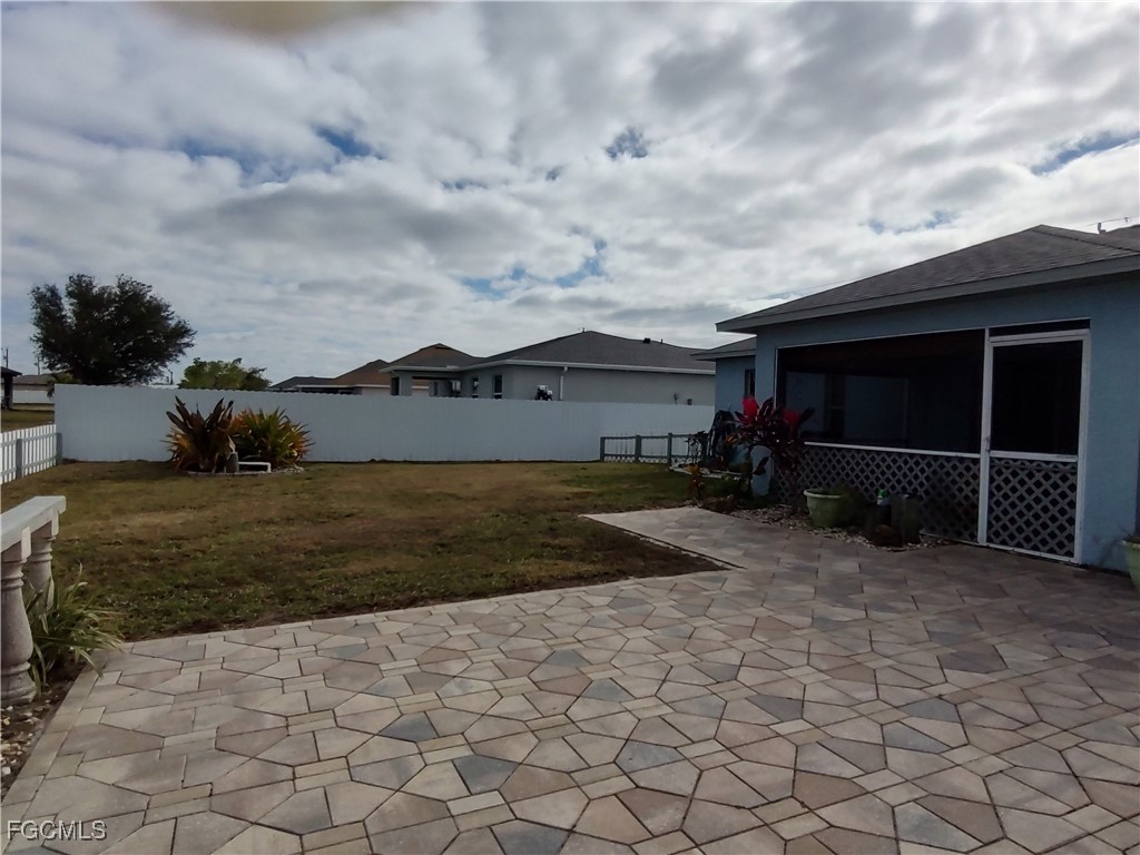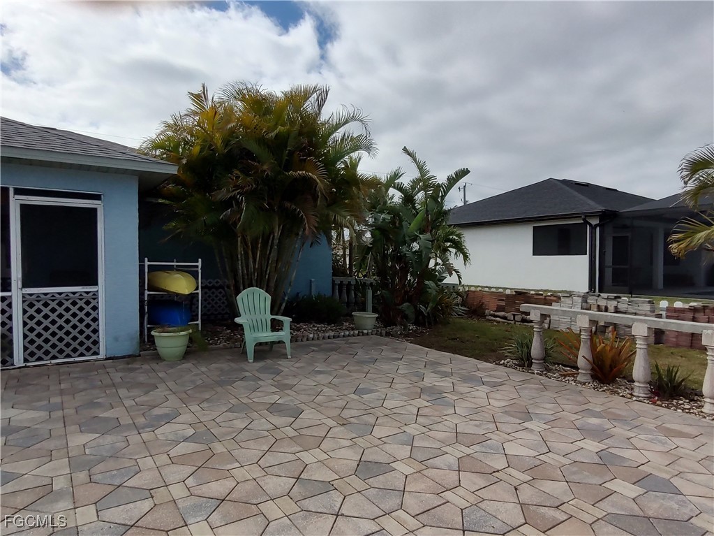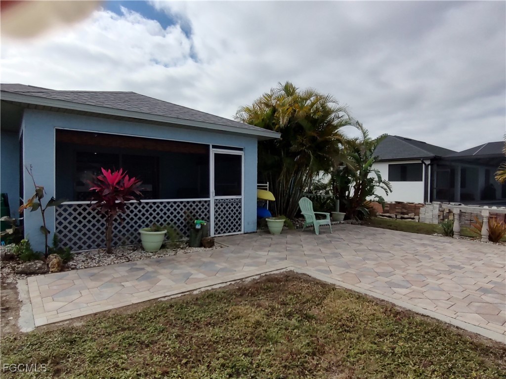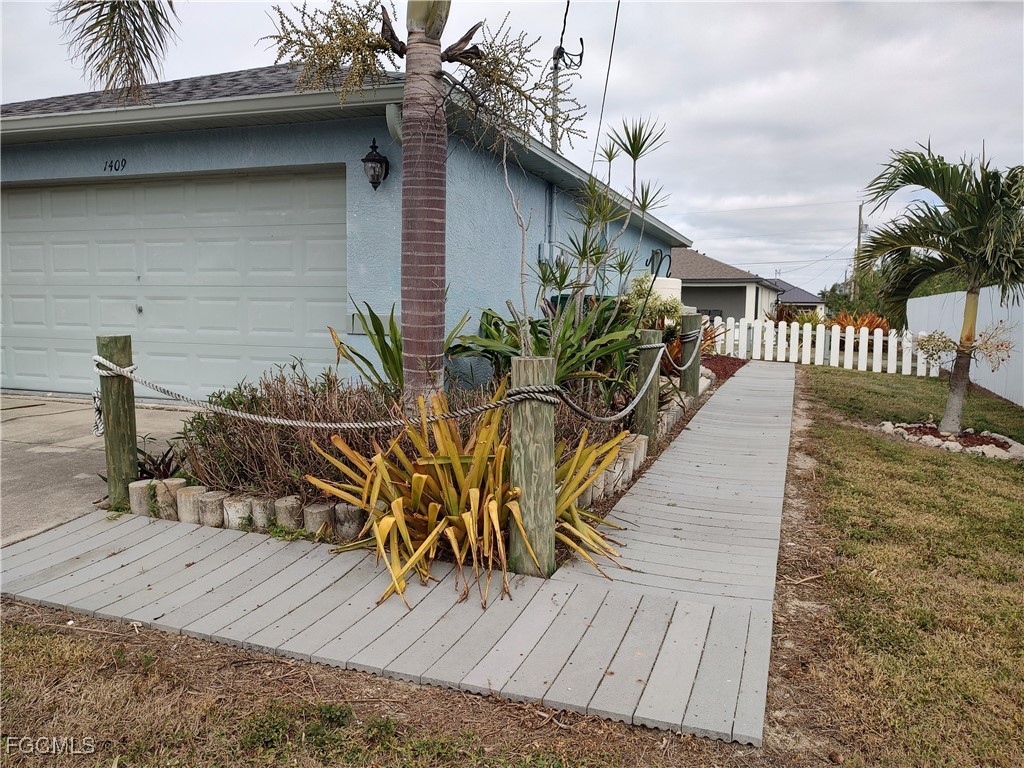 This charming coastal style home will delight you beginning with exceptional terraced landscaping in tropical style, including a boardwalk extending around the side of the house for easy access to a/c and water system. Entering the living area, you'll notice a lovely split bedroom floorplan and center stage is the Den with French doors. A jack-n-jill bathroom connects both guest bedrooms. Primary bedroom includes walk-in closet and ensuite bath with shower. Beautiful custom designed countertops enhance the breakfast bar and eat-in kitchen with attractive built-in shelves and cabinetry in the dining area for display and extra storage. Step out into the screened lanai and enjoy entertaining with the huge open stone patio. The garage features lots of great built-in storage for all your projects and stuff. Great location with schools and parks nearby and just minutes to shopping. Furnishings are negotiable.