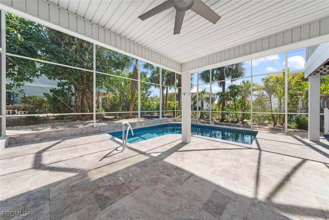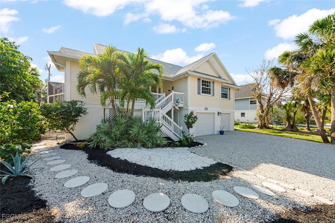 East End Sanibel Beauty – Just Minutes to the Beach! Welcome to your slice of paradise in the sought-after Sanibel Estates community! This elevated island retreat is nestled just moments from the beach and offers the ultimate blend of style, comfort, and convenience. From the moment you arrive, the lush setting and charming curb appeal will capture your heart. Step inside to soaring vaulted ceilings with striking white cross beams and gleaming hardwood floors that frame a stunning floor-to-ceiling Shellstone electric fireplace – the perfect focal point for your living space. The open-concept kitchen features a breakfast bar ideal for morning coffee or evening gatherings. The spacious primary suite includes a dedicated office nook, a custom walk-in closet with organizers, and serene privacy. Enjoy modern upgrades including a new roof, new A/C units, tankless water heater, and hurricane-rated garage doors. Take the elevator (vertical lift) conveniently located off the front porch or head out to your newly renovated saltwater pool oasis with travertine decking, a two-story panoramic pool cage (no seeum screen), and a lower-level patio with outdoor shower – perfect for post-beach rinse-offs.Bonus features include a separate laundry room, utility closet, and an oversized two-car garage with plenty of storage.