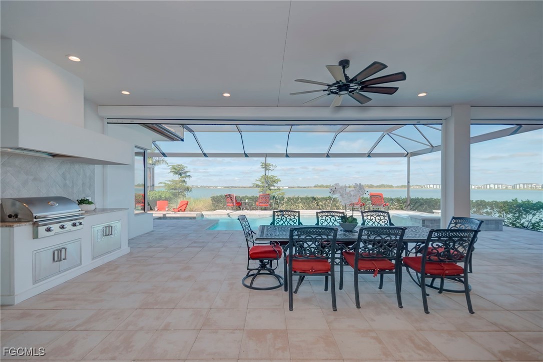 Soaring 12-foot ceilings with dramatic beam details and walls of impact glass fill the residence with natural light while framing expansive lake views. Designed for resort-style living, the outdoor oasis is truly exceptional—featuring a sun deck, water features, spa, and a sunken lounge with a conversation fire pit, creating an entertainer’s paradise set against tranquil waterfront scenery. An outdoor kitchen completes the space, ideal for seamless indoor-outdoor living.