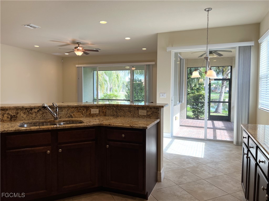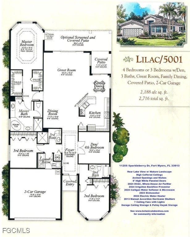 Pow! Your first impression is a spectacular view of calming water! Welcome! You immediately focus on peaceful rear water views, framed by a formal foyer. See arched openings, transom glass, arched niche, 14’ high coffered ceiling, sparking overhead chandelier & double doors to the side den. This very desirable, popular floor plan was designed for family & flexibility. It features 2 dining areas, split bedrooms, functional walk-thru kitchen with bar, inside laundry, & wrap-around screened lanai facing the water view. The view is framed by two mature miniature coconut palms, ripe with coconuts, a fruiting papaya tree, and herb garden. Strategic site planning results in privacy from adjacent neighbors. The 12’6” x 18’4” master bedroom looks out to a water view through angled walls & a 10’6”’ tray ceiling. The 3rd bedroom, den & 3rd bathroom can function as a secondary owner’s suite. Add optional laundry sink, shelves & hanging rod. Newer improvements in 2024 are a 3.5-ton 14 SEER air conditioning system with an “APCO fresh-aire UV” whole-house air purifier, a Culligan water softener, a Samsung microwave, a garage electric water heater & the HOA required irrigation “backflow preventer”. Be aware some homes have not yet made this required utility improvement. A Samsung dishwasher was installed in 2023. Screened entry allows cross ventilation from front to back & secure deliveries. White, accordion, manual hurricane shutters were added in 2013. Dual white-wire loft storage units were added in the garage ceiling, along with a kayak storage system with pulleys & ropes. Newer washer & dryer. Just one owner! The sellers purchased this GL Homes “Lilac” model in 2011 & upgrades were added during construction: higher 6” floor base molding, turned 45-degree, neutral square tile floor in the foyer, hall, kitchen, both dining areas & great room. A granite backsplash was added in kitchen under 42” high upper cabinets & 7 ceiling fans with lights. Std features of this model are high ceilings, arched openings, 8’ high white paneled doors, arched niches, tub, shower & sit-down vanity in master bath, window coverings, nickel hardware & pulls, wood cabinets, granite countertops, recessed medicine cabinets, security system & sliding glass doors to the screened lanai. NOT IN A FLOOD ZONE. Community assets are the very impressive Gatehouse Entry with mature landscaping, underground electric, street lighting, internet, landscape maintenance & connecting underground lakes allowing fishing. Buyer will transition from Comcast security system to ADT prior July 2026. Botanica Lakes is a thoughtfully planned community with manned gate 24 Hr/Day. See botanicalakeshoa.com for extensive community amenities, photos and info. Download all current HOA documents by clicking on the Sales & Leasing tab.