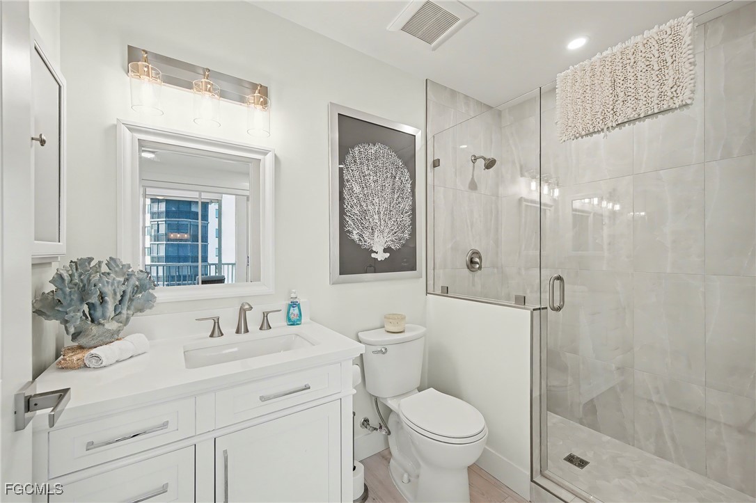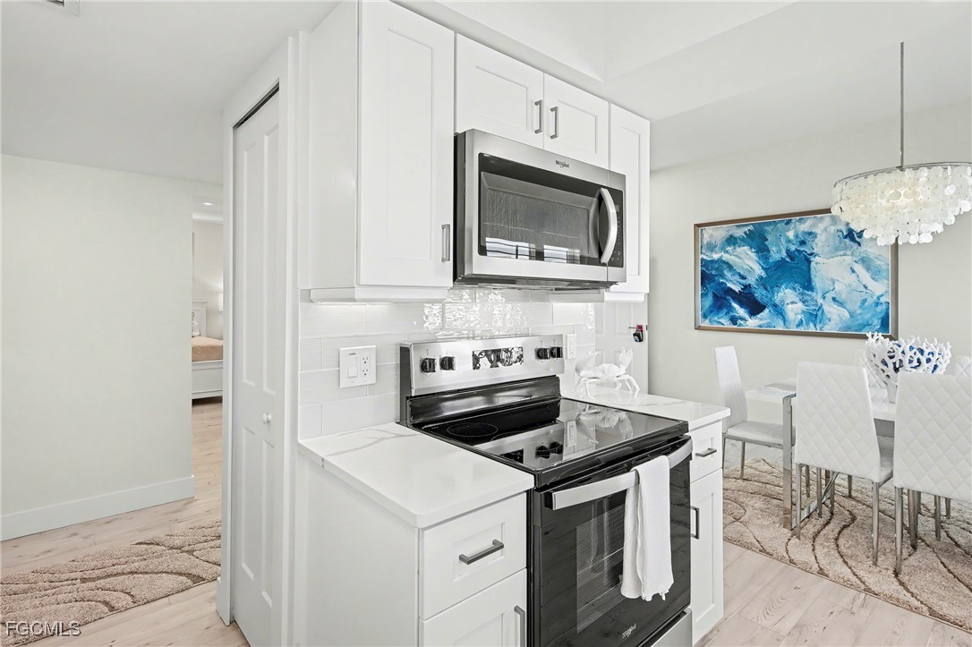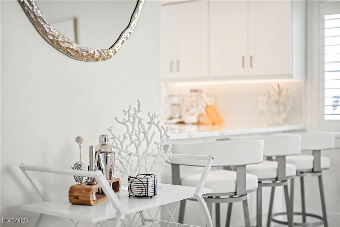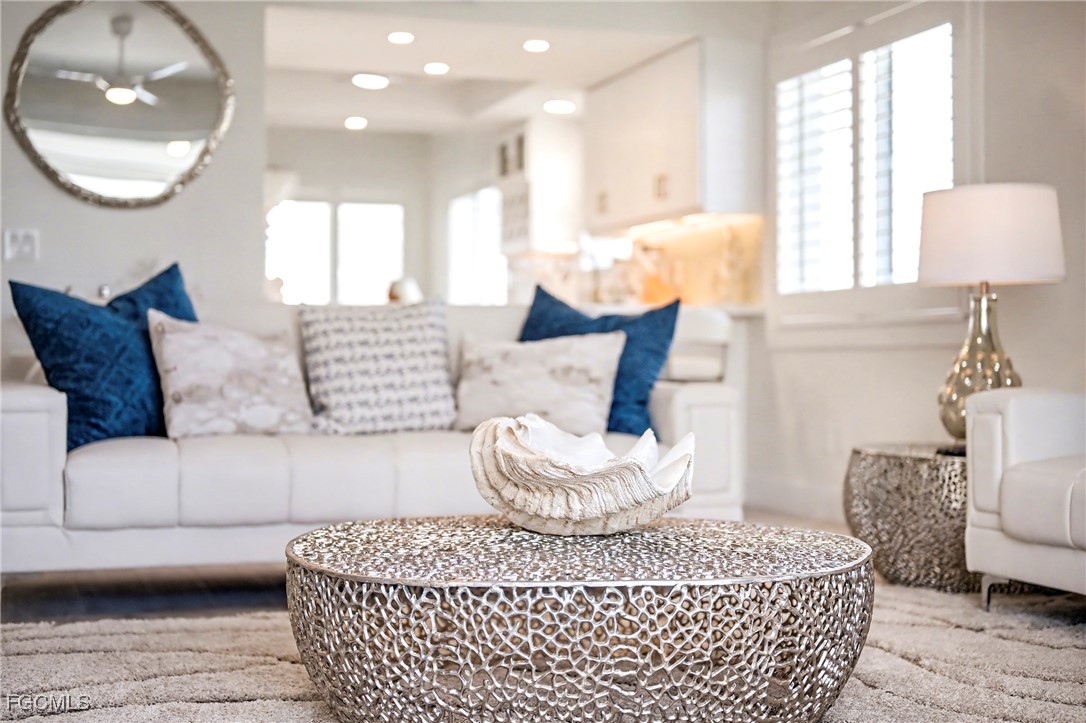 Corner Penthouse featuring 9 ft ceilings at Casa Marina shows like a model. This 2024 remodel opens the view from kitchen to living area and intersecting waterways. Timeless shaker cabinets and quartz counters with accents of brushed nickel hardware throughout the condo. Updated lighting and porcelain wood grain tile in every room with modern baseboards to match the updated door frames. New two-panel doors and hardware stay consistent with the decor. Primary and guest bath total remodels include glass sliders in guest and full glass doors in primary bath. Two walk in closets. The laundry area is also enclosed with two panel doors on the spacious lanai. Plantation shutters on the windows offer privacy or water views and Electric Hurricane Shutters enclose the lanai area. This condo is a great choice if your live here as a snowbird, retiree or still working and want a place to call home. You can also rent it out sometimes. Unit comes with upscale decorator furniture package and an under building parking spot. For boater's, dock # 55 is also for sale separate from the condo. The nearly new bay beach commons offer trails, shade under the covered tiki huts, tennis, pickleball, shuffleboard, golf putt and chipping greens, and members of Casa Marina association also have an onsite pool and access to the fishing pier at Waterside plus the updated beach access with shaded seating area under a tiki hut. Pet friendly for owners. 14 day minimum rentals allowed.
