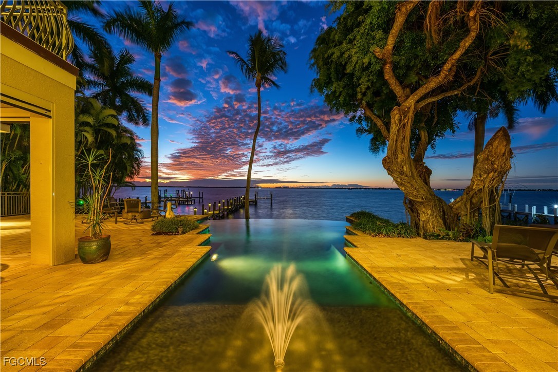 Welcome to 2840 Valencia Way, an extraordinary Caloosahatchee Riverfront estate offering nearly 7,000 square feet of refined living in one of Fort Myers’ most coveted waterfront neighborhoods. Offered fully furnished and professionally decorated, the home is completely move-in ready. This impeccably maintained residence features 4 bedrooms, 4 full bathrooms, 2 half bathrooms, 2 private offices, a game room, full movie theater, gym, and elegant living spaces designed for both everyday comfort and grand entertaining. The first-floor primary suite captures breathtaking river views with great sunset exposure and provides direct access to the pool and spa, creating a truly private retreat. The outdoor living space is exceptional, highlighted by a heated infinity-edge pool, spa, multiple covered entertaining areas, outdoor kitchen, and a well kept backyard leading to the private dock and boat lift—perfect for enjoying life on the river. Commonly, bridge noise on McGregor river front properties is apparent. Not here, your view will be met with a relaxing and serene quietness not found on all other riverfront properties. Evenings offer some of the best views you could imagine with year-round stunning sunsets. Notable upgrades include a new standing-seam metal roof (2024), impact windows and doors, new insulated garage doors (2025), Sub-Zero refrigerator (2021), Wolf range, dual Monogram dishwashers, and a whole-home WiiM audio system. Upstairs, the game room features a full bar with an ice maker and kegerator, while the dedicated theater delivers a premium cinematic experience with a high-end projector and surround sound system. Ideally located just off of McGregor Boulevard, this premier waterfront enclave offers quick access to Downtown Fort Myers, Sanibel Island, Fort Myers Beach, RSW International Airport, premier shopping and dining, and top-rated schools. 2840 Valencia Way is a rare offering where old-world craftsmanship meets modern luxury, delivering an unmatched riverfront lifestyle.