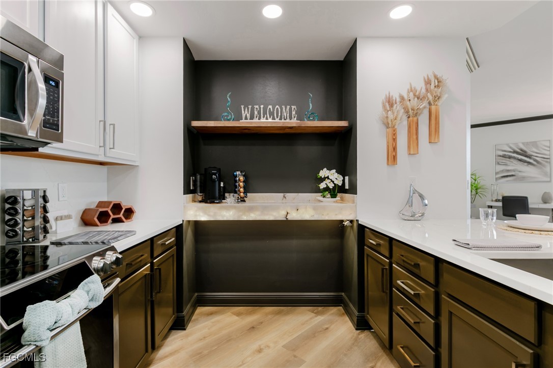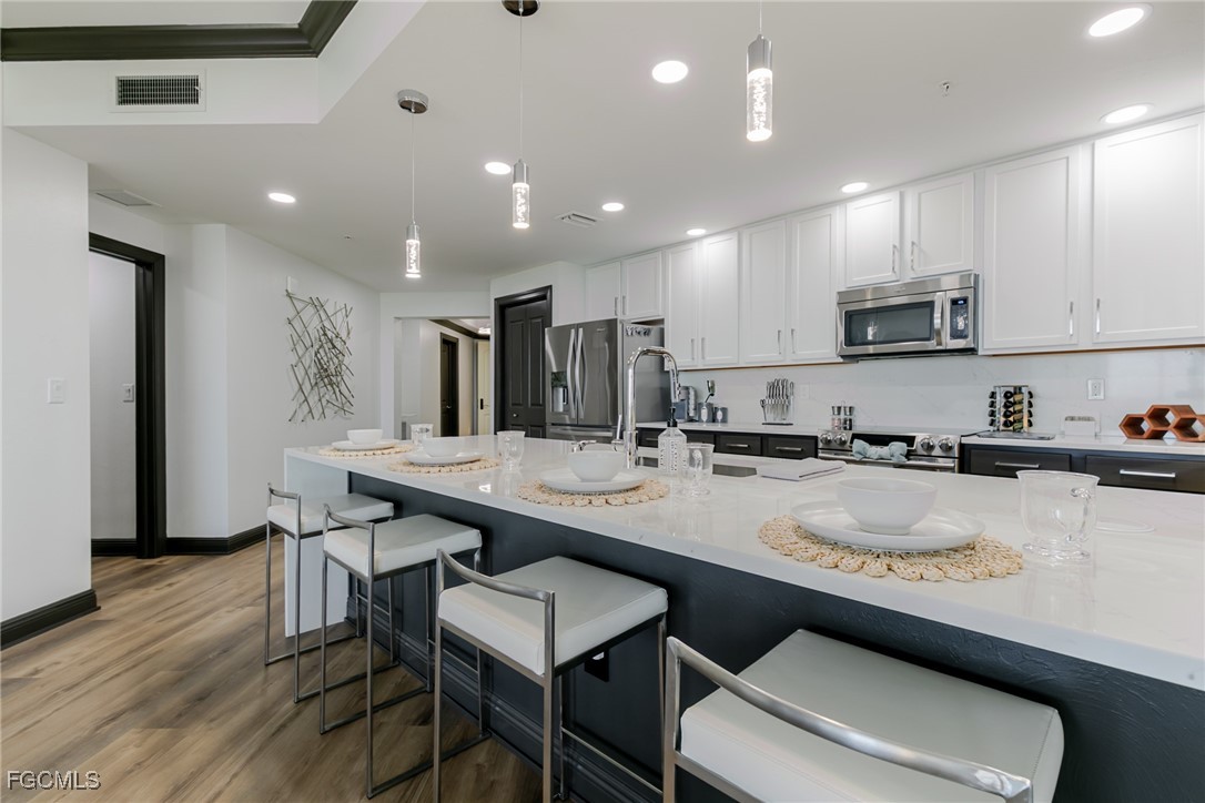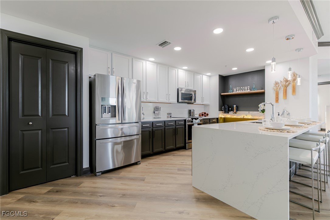 When Only the Best Will Do. This exquisite luxury residence truly checks every box. Perched on the 6th floor, this stunning condo offers breathtaking panoramic sunset views and over 1,800 square feet of completely reimagined living space, thoughtfully designed with high-end finishes and custom details throughout. Step through the elegant foyer into a spacious great room, ideal for entertaining family and friends while enjoying expansive views from every window. The kitchen is an entertainer’s delight, featuring a grand quartz waterfall island, premium appliances, and a custom-built onyx-lit coffee bar. The primary suite offers a serene retreat, complete with a custom California Closet system and a spa-inspired bathroom boasting a walk-in shower, dual quartz vanities. All this and private access to the lanai for enjoying the marina lifestyle. The guest suite is equally impressive, serving as a second primary with its own beautifully appointed bathroom. Located in a highly sought-after marina community, you’ll enjoy access to an array of on-site amenities including restaurants, boutiques, entertainment, boat slips and boat rentals available through the Marina. Additional features include a clubhouse, fitness center, two pools and tennis courts, all available at your fingertips. Don’t miss the opportunity to experience this exceptional waterfront lifestyle. Schedule your private tour today!