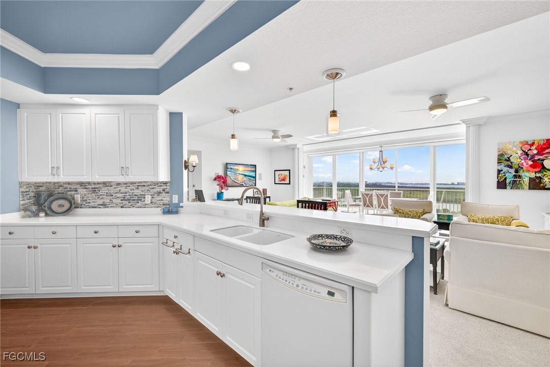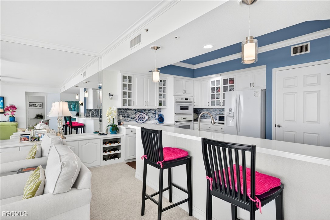 The expansive living room features custom built-ins with a wine rack, wall-mounted TV, and integrated speakers—perfect for relaxing or entertaining against a stunning waterfront backdrop. The kitchen is thoughtfully designed with white cabinetry, pull-out drawers, tile backsplash, solid-surface countertops, breakfast bar, and a walk-in pantry.