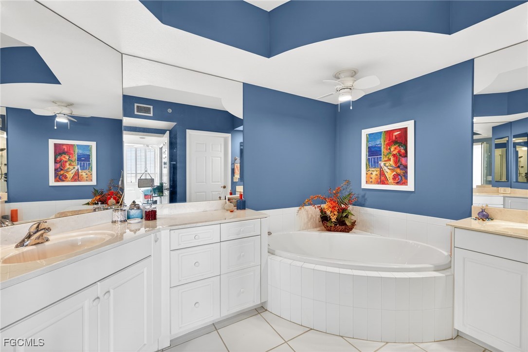 A desirable split bedroom floor plan offers privacy for owners and guests alike. The primary suite includes two walk-in closets, plantation shutters, and a spa-like ensuite bath with a soaking tub, walk-in shower with frameless glass door, and additional storage. Two guest bedrooms also feature plantation shutters and share a well-appointed guest bath with a frameless glass walk-in shower.
