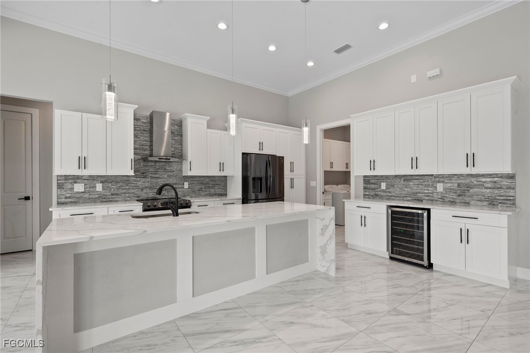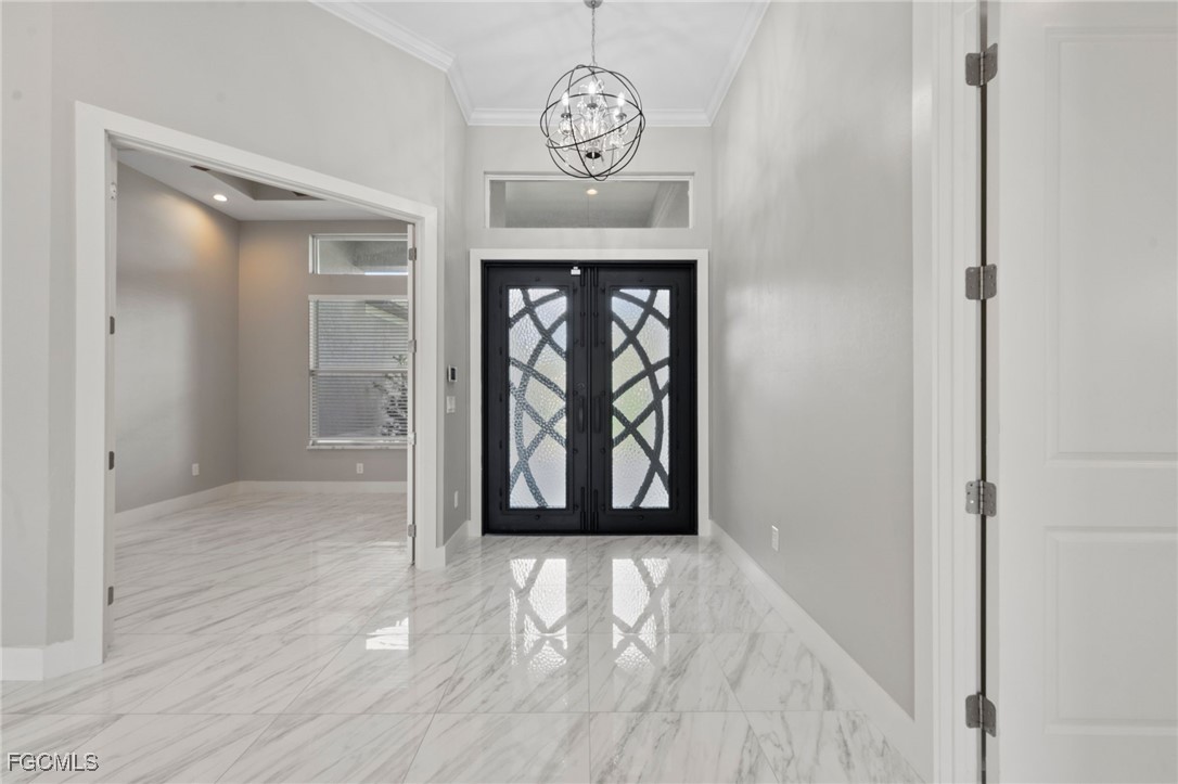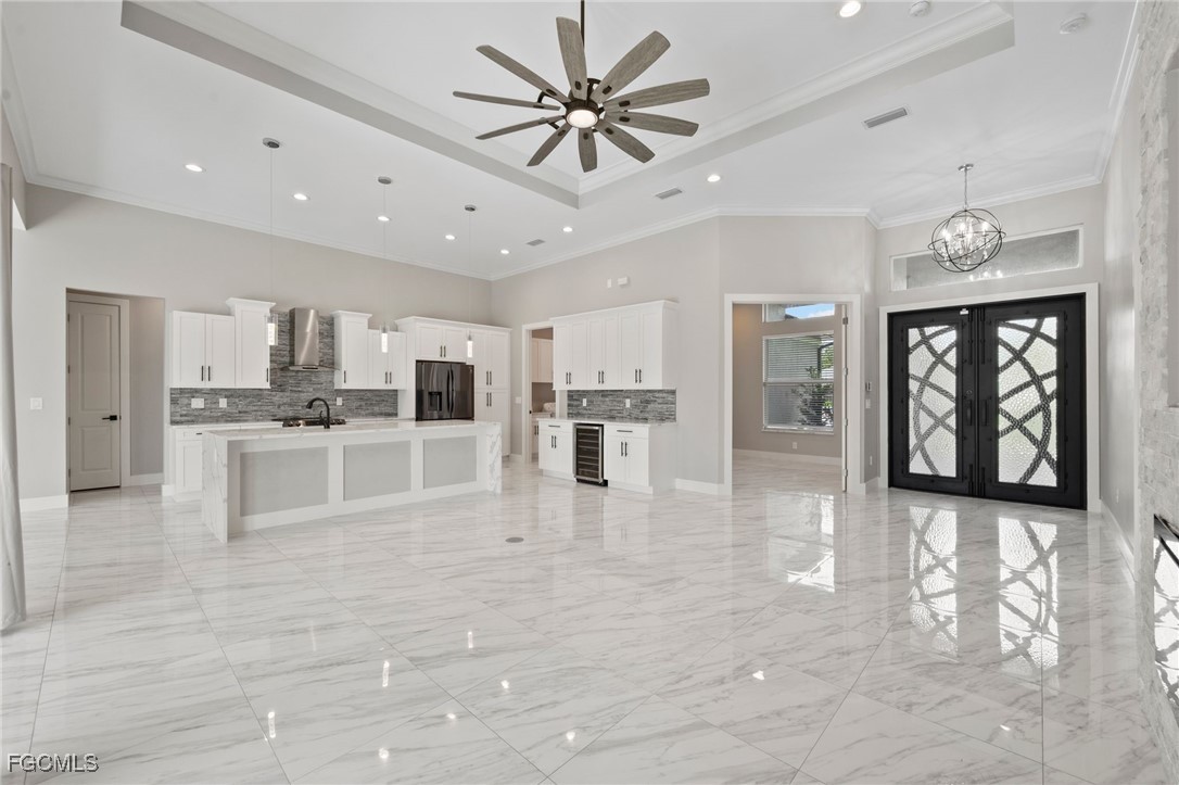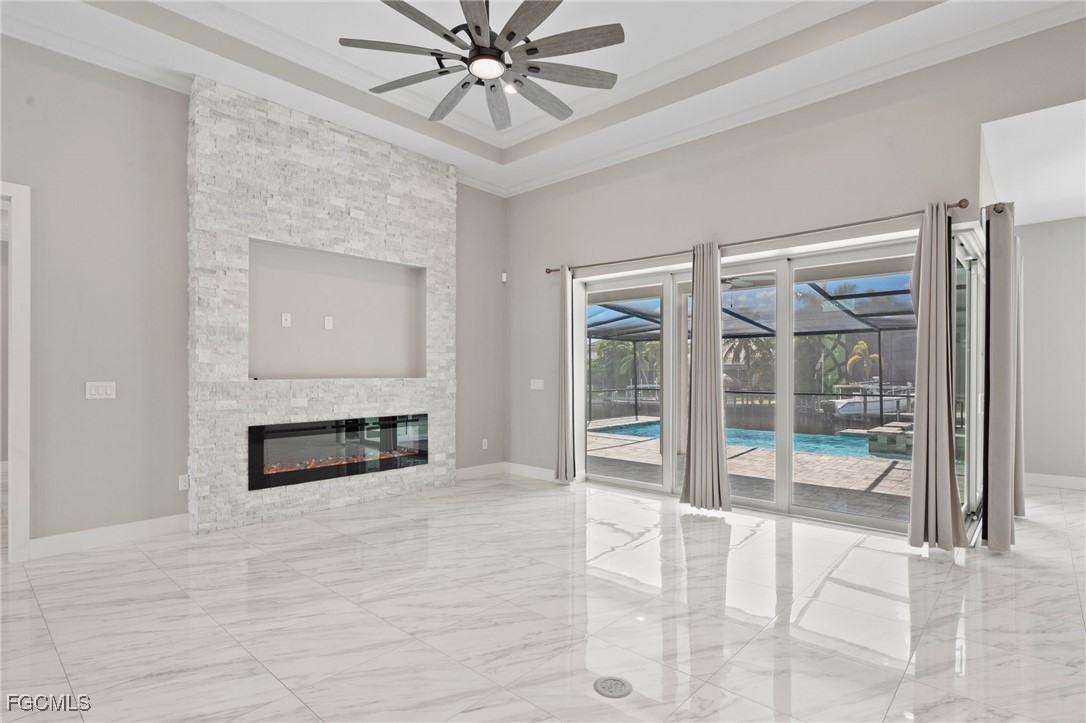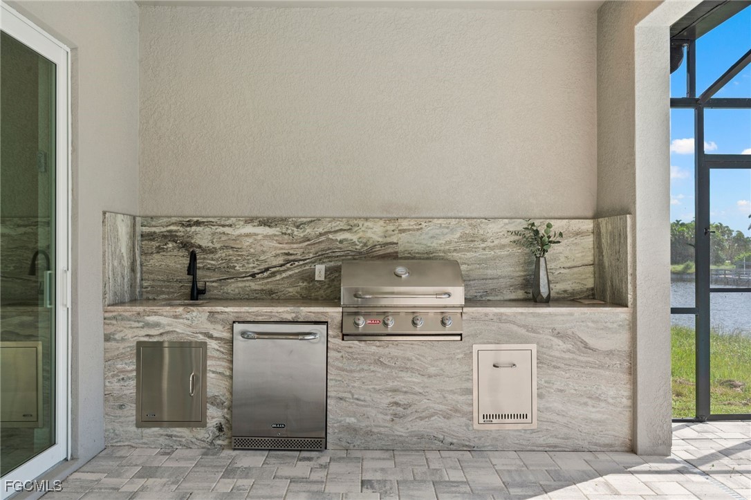 Direct Gulf access Pool Home in SW Cape Coral! No bridges to open water. Built in 2022. This modern, move-in ready, waterfront beauty sits on a wide canal with a Seawall and Dock. Step through elegant wrought-iron double doors into an open, living space with custom stone fireplace, zero-corner sliders and seamless indoor/outdoor flow. Impact resistant glass throughout. The chef’s kitchen is a showstopper with Quartz counters, waterfall island, stainless appliances, beverage fridge and a stylish coffee bar. Featuring 3 spacious bedrooms plus a den/office/flex space and 3 full bathrooms, including a guest en-suite with pool access. The owner’s suite boasts a sitting area, walk-in closets, dual vanities and a spa-inspired walk-through shower. Your private outdoor Paradise includes a negative-edge pool, spa and fully equipped outdoor kitchen, all set against Western exposure sunsets. Expansive, screened Lanai with room to lounge and dine. Oversized 3-car garage with epoxy floors and extra storage. Enjoy year-round waterfront living, just minutes from restaurants, shopping, farmers markets and endless boating destinations across Southwest Florida. Whether you are seeking a permanent residence, vacation retreat or investment property, this Home checks all the boxes.