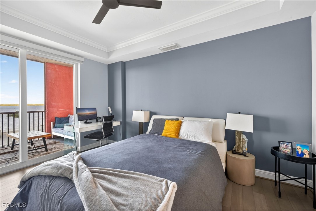 The primary suite showcases river views, balcony access, a walk-in closet, and a spa-style bath with dual vanities, rimless glass walk-in shower, and soaking tub. The second guest bedroom functions as a junior suite with a full vanity and direct access to the second bath. The third bedroom is bright and airy with direct balcony access. Murphy bed in the guest bedroom is included in sale.