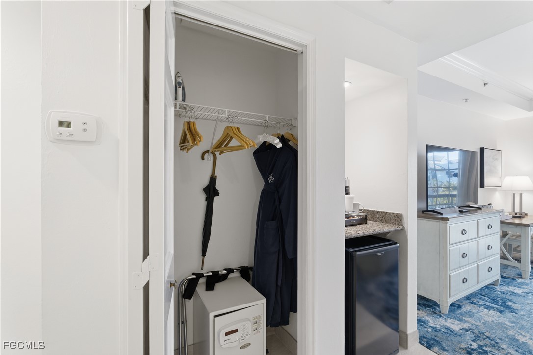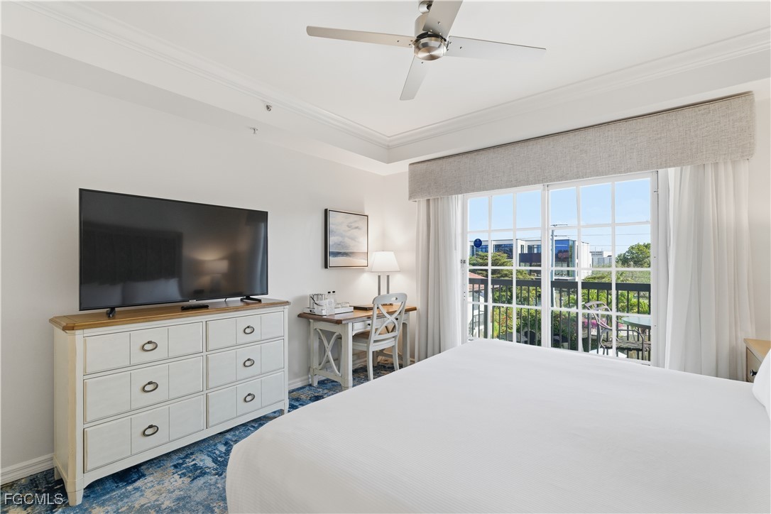Seldom available studio residence at Bellasera, one of only ten studio units within the community. Located on a secure, private-access floor served by an elevator exclusive to the studio corridor, this residence features an open living and sleeping area, generous closet storage, and a full bathroom. A private balcony overlooks the resort-style pool and landscaped courtyard, offering a peaceful setting. The unit is offered turnkey furnished for immediate use . Bellasera is a boutique condominium-hotel community conveniently situated near Fifth Avenue South, Tin City, the Naples Design District, and Naples’ renowned Gulf beaches. Community amenities include concierge services, shuttle transportation, a heated pool and spa, fitness center, bicycle rentals, The Claw Bar restaurant, and The London Club featuring on-site live music. Owners may occupy the residence for up to 150 days per calendar year. When not in residence, owners may elect to participate in the on-site rental program or pursue approved longer-term rental arrangements, all in accordance with association rules and guidelines. A low-maintenance ownership opportunity in a prime downtown Naples location.