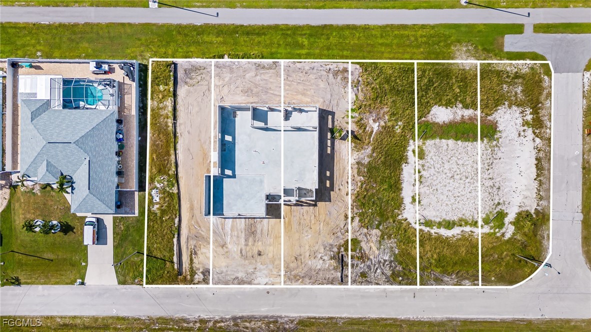 UNDER CONSTRUCTION / AS-IS opportunity on a rare oversized ~0.70-acre assemblage in NW Cape Coral (30,492 SF / Lots 43–48, approx. 245’ frontage x 125’ depth). Planned for a 3-bedroom + den, 3-bath home with 2,590 SF living area (3,856 SF total), 4-car garage, and a large screened lanai (per plans). Significant work has already been completed, including design/engineering, permits/fees, site work/fill, slab, CMU block/beam, and site preparation. Septic and well have been started, trusses are underway, and initial plumbing and electrical work have begun (buyer to verify current field status). SOV/budget summary available showing line-item scope and remaining work values. Plans are included—buyer takes over and completes construction, selecting all materials, systems, and finishes. Finish level is buyer-controlled (standard to high-end), subject to plans, budget, and buyer’s due diligence on neighborhood pricing/ARV. No appliances, finishes, cabinetry, countertops, windows/doors, fixtures, or systems are represented as included unless independently verified by buyer. Additional upside: preliminary ~40’ x 50’ detached garage/workshop concept plan included (buyer to verify feasibility, approvals, and permits). Sold as-is / where-is. Buyer to verify current construction stage, plans/specs, permit status, impact fees, assessments, and all information and material facts.