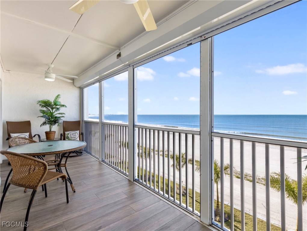 Stunning Gulf of Mexico beachfront views define this turnkey 4th-floor end-unit condo — a beautifully renovated coastal retreat designed for comfort, style, and effortless living. This fully updated 2-bedroom, 1.5-bath residence features tile flooring throughout and thoughtful designer touches, including plantation shutters and chic coastal furnishings. The split-bedroom layout offers privacy for you and your guests, while the bright and spacious great room takes full advantage of the natural light only an end unit can provide. The modern kitchen shines with Cambria countertops, new stainless steel appliances, a convenient bar-top seating area, and a cozy dinette space. Step outside to your private lanai and listen to the waves roll in — the perfect spot to unwind and take in the Gulf breeze. Tile flooring extends outdoors for a seamless indoor-outdoor feel. Peace of mind comes standard with impact-resistant windows, doors, and sliders, complemented by electric hurricane shutters. A rare bonus: this unit includes coveted under-building parking. Whether you choose to enjoy this condo year-round or take advantage of the flexible 7-day rental program, the possibilities are wide open. Spectacular sunsets, sugar-white sand, and the vibrant energy of Fort Myers Beach — now in full resurgence — are all at your doorstep. Minutes from shopping, dining, entertainment, and local hotspots. This is more than a condo — it’s your place in paradise. Welcome home.