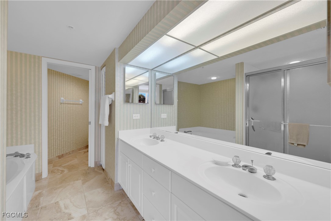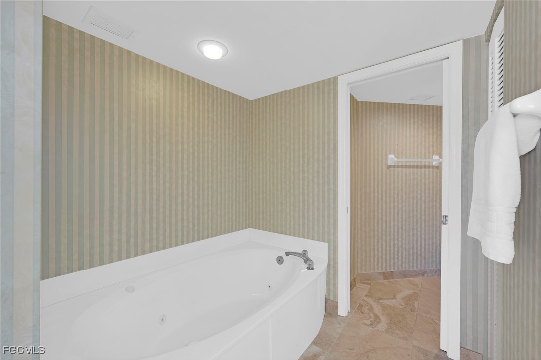 The primary suite offers private balcony access and a beautifully appointed bathroom complete with a stand-alone soaking tub, separate shower, and double-vanity sinks. The guest bedroom is comfortable and inviting, with an adjacent bathroom featuring a tub/shower combo.