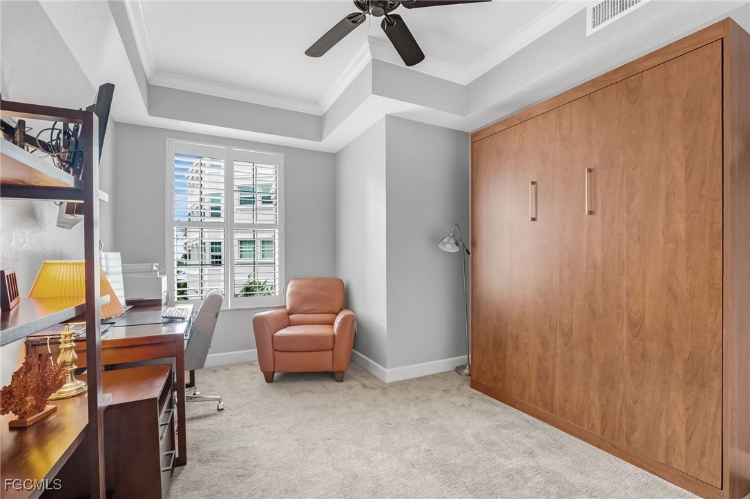 The second bedroom, currently utilized as an office, includes a Murphy bed for versatility. The third bedroom is generously sized and features a charming window bench—ideal for relaxing with a good book. The second full bath offers a walk-in shower and single vanity.