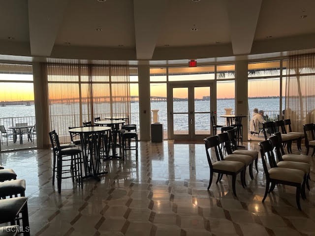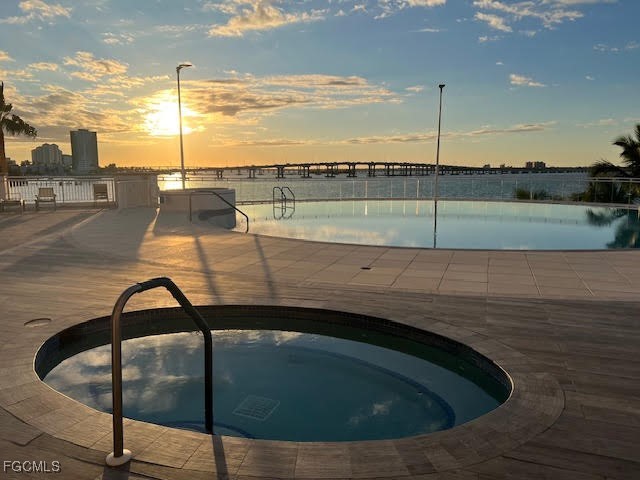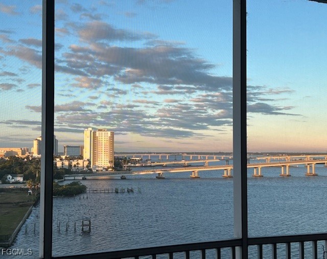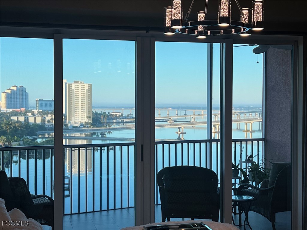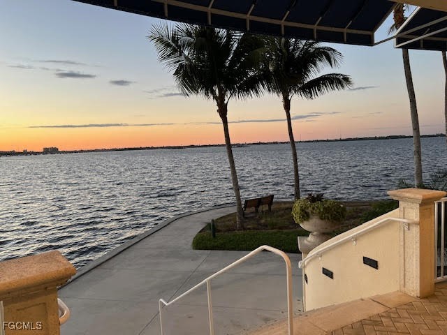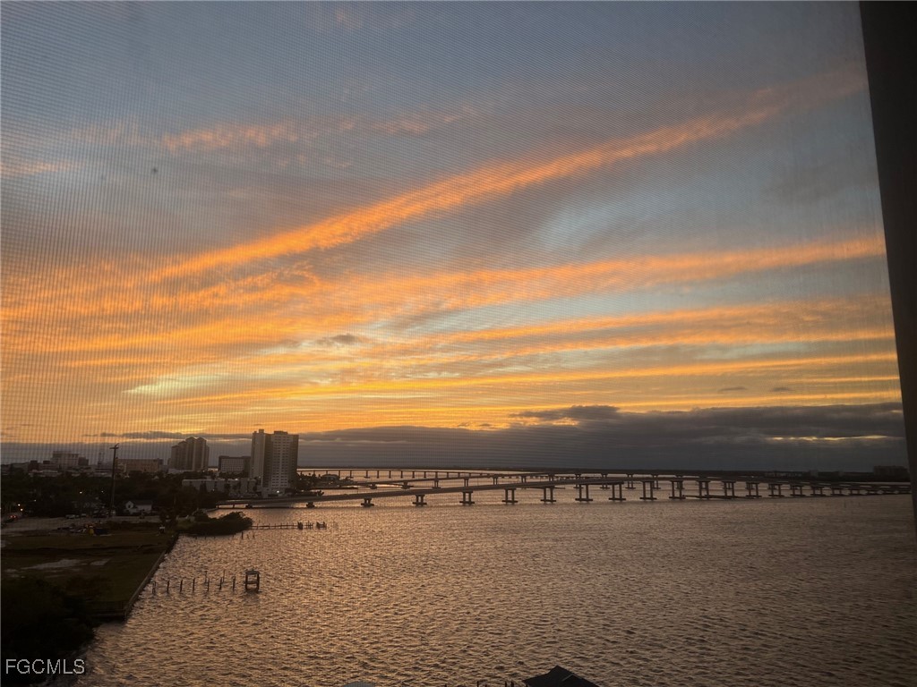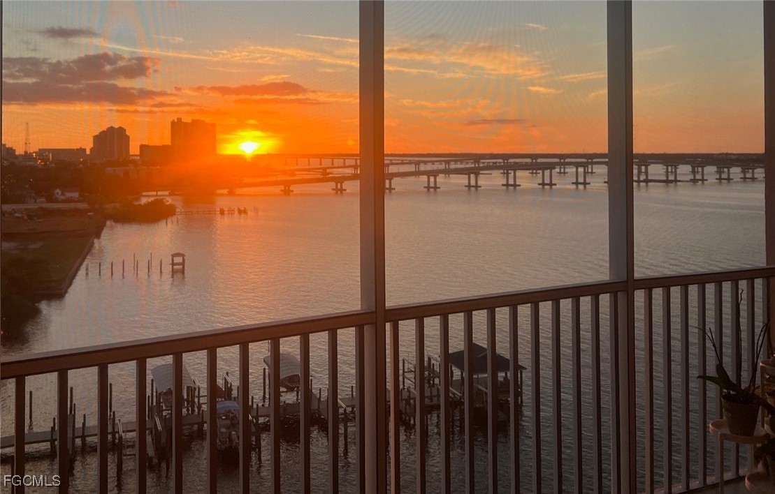 Gorgeous waterfront unit with Sunset views from the private balcony every day of the year! Large white tile throughout. Large primary bedroom with sliding glass door to balcony. Two custom walk-in closets. Pocket privacy door for the two additional guest bedrooms and bathroom. Custom cabinets in the large kitchen. Resort style common areas including infinity pool on the Caloosahatchee River with a hot tub. Pickle Ball courts. Grills, pool table and fitness center. Attached garage under the building, semi-private elevator opens directly into the unit.