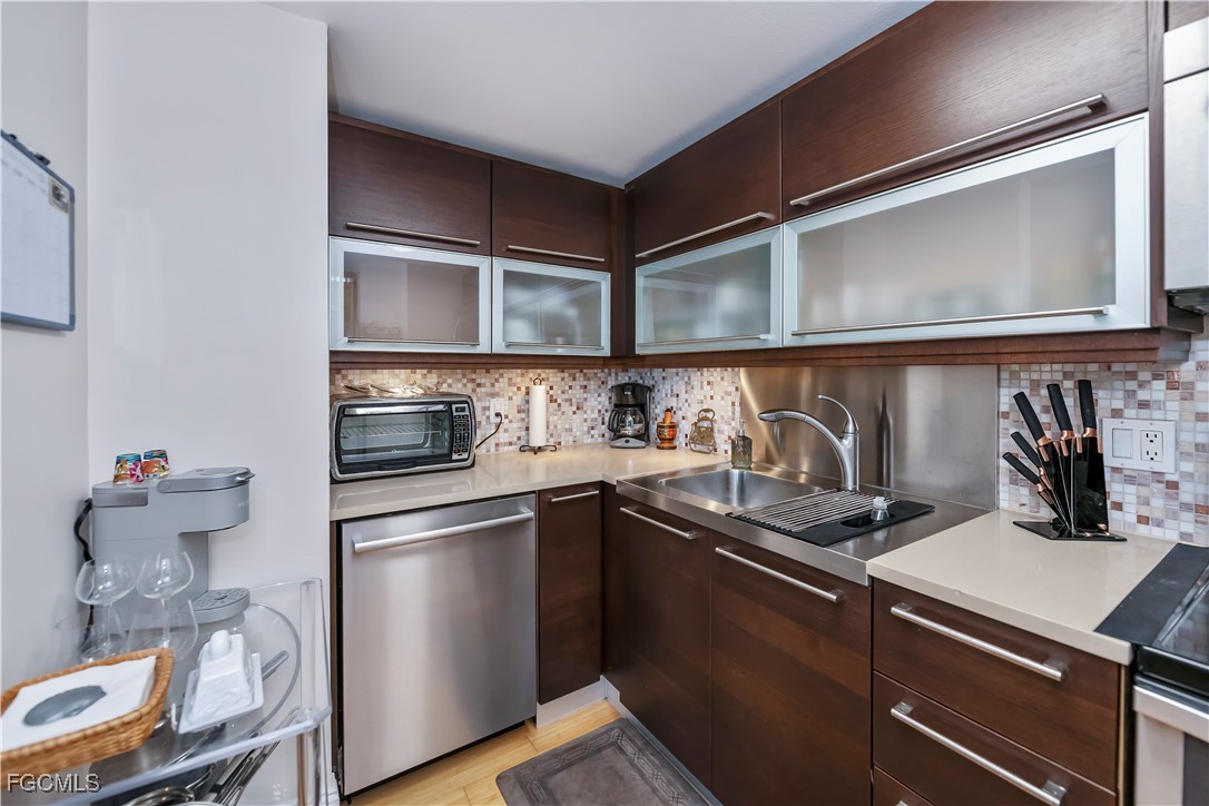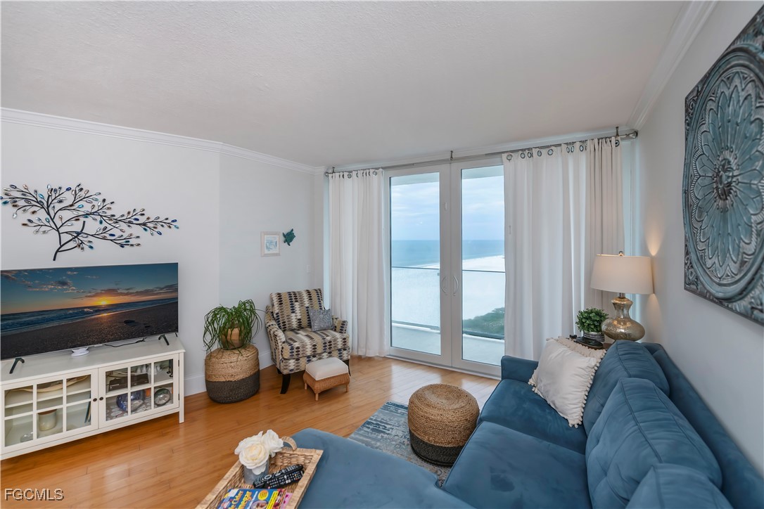 Enjoy two spacious king-sized bedroom suites, each offering tranquil sunset vistas from nearly every room, plus a dedicated office space. Features include impact-resistant windows and sliders, elegant crown molding, genuine bamboo wood flooring throughout, tastefully remodeled interiors, generous walk-in closets, updated fixtures and lighting, a new air conditioning system, and a hot water heater installed in 2022. Conveniently located closest to the elevator and laundry room, this home offers added ease and low HOA fees that include cable, internet, and water.
