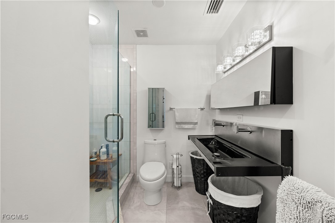 Timeless finishes include stainless steel appliances, a sleek stainless steel backsplash, and glamorous white glass countertops that are heat, stain, and mold resistant for effortless maintenance. The kitchen is fully equipped with a Samsung French door refrigerator with internal ice maker, Bosch smooth electric cooktop, ultra quiet Bosch dishwasher, Electrolux convection microwave/oven, wine fridge, pull-out faucet, a large single stainless steel sink, and a slanted stainless steel vent hood with exterior high-CFM venting. Wide pull-out drawers with soft-close hardware, along with built-in cutlery and garbage drawers, complete the space with both style and function.
