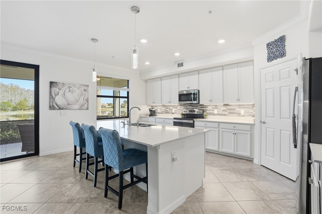 Enjoy Florida resort style living at its finest in this first-floor coach home with peaceful lake views, located in the Amenity Rich gated community of Arborwood Preserve in Fort Myers. This open 1781 SFT, light-filled floor plan is perfect for both everyday comfort and entertaining, with spacious living areas and a screened lanai overlooking the lake—an ideal spot for morning coffee or sunset relaxation. * Features include a gourmet kitchen featuring large island, designer white cabinets, quartz counter tops, stainless steel appliances, tile floors throughout all living spaces, and crown molding elevates the space. Rare 2 car attached garage for all your storage needs. HURRICANE WINDOWS AND SLIDERS OFFER STORM PROTECTION AND THIS PROPERTY IS NOT IN A FLOOD ZONE. Residents of Arborwood Preserve enjoy world class resort-style amenities, including a spectacular WATERFALL pool, fitness center, community room, tennis and pickleball courts, bocce, theater, coffee lounge, gym, fitness studio, art room, card room, walking trails, and a full social calendar. Designed as the hub for all social activities, the 23,252-square-foot Town Center will offer something for everyone. Perfectly situated near shopping, dining, entertainment, RSW Airport, and the beaches of Southwest Florida, this home offers the ideal blend of lifestyle and location. Whether you’re seeking a seasonal retreat or full-time residence, this lakefront coach home delivers comfort, convenience, and the best of Fort Myers living.