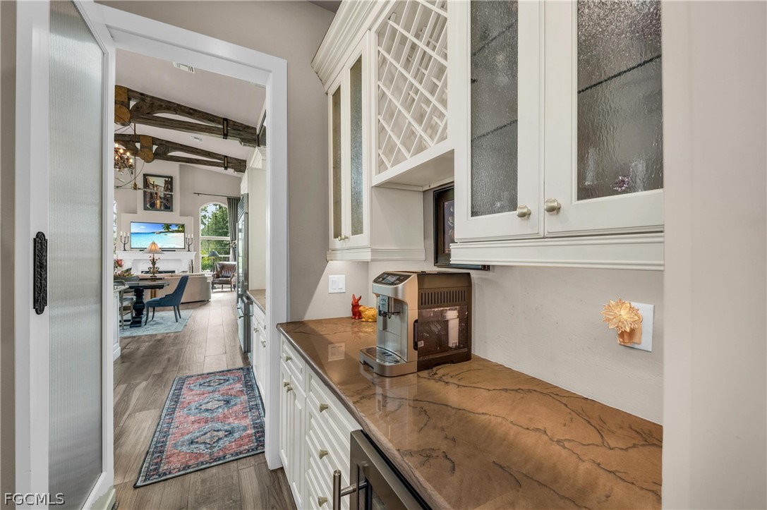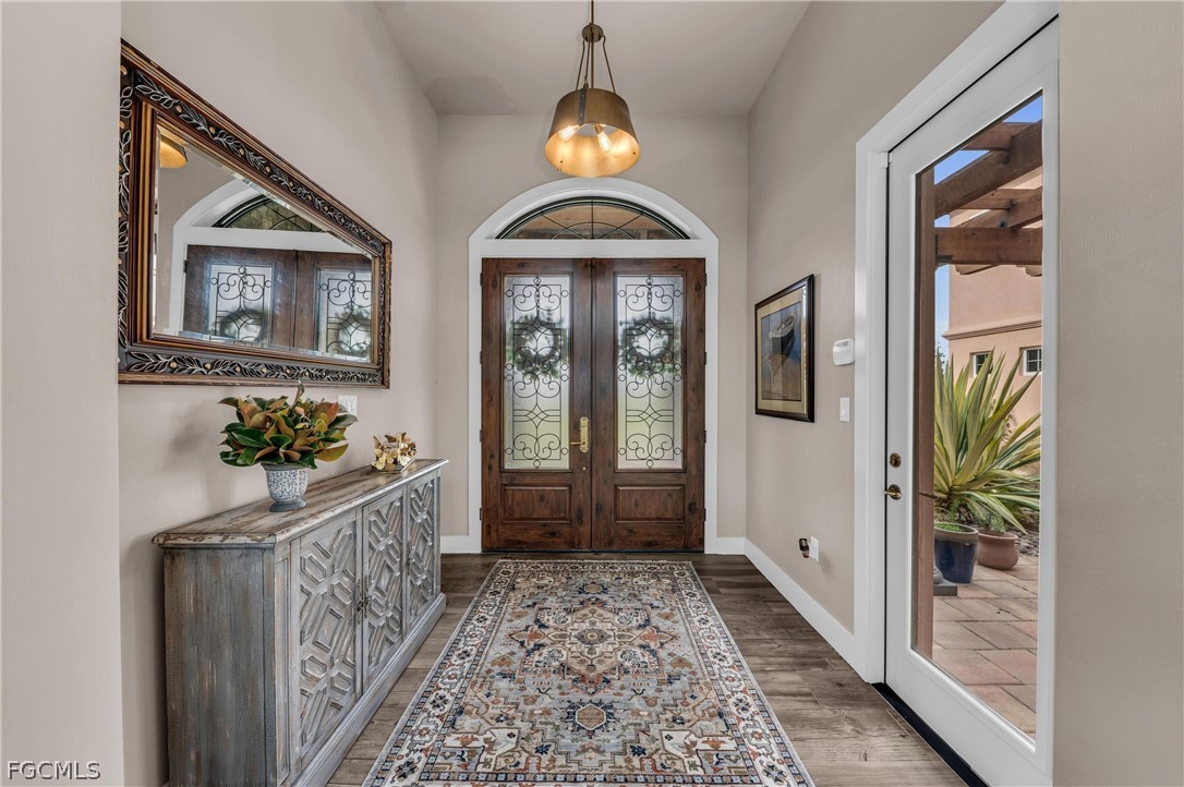 Tucked away within the deed-restricted, secluded enclave of Herons Cove, this exceptional estate offers refined waterfront living amid 4.13 acres of pristine native landscaping. Encompassing 4,976 square feet, the residence is thoughtfully designed to balance luxury, privacy, and functionality, with four bedrooms and three bathrooms crafted to the highest standards. A private boat dock with a 10,000-lb electric boat lift and canopy provides effortless access from the Peace River to Charlotte Harbor, while the meticulously maintained grounds feature a full irrigation system and landscape lighting, creating a serene ambiance day and night. Peace of mind is ensured with a whole-home generator supported by a 500-gallon underground gas tank, hurricane impact windows and sliding glass doors, and an electric hurricane shutter protecting the double front entry featuring gas lantern lighting. The exterior is complemented by a paver driveway leading to a three-car garage with tile and metal roof. The third garage bay includes air-conditioned holiday storage and an additional climate-controlled room, ideal for specialty storage or flexible use. At the heart of the home, the gourmet kitchen is a chef’s dream, featuring a Wolf six-burner gas range, double ovens, a Wolf built-in microwave, and an extra-large Sub-Zero refrigerator. An expansive granite center island with prep sink and abundant under-counter cabinetry anchors the space, while a large pantry offers shelving, custom cabinets, a wine refrigerator, and a built-in wine rack. Adjacent living areas are warmed by a gas fireplace, creating an inviting atmosphere for both everyday living and entertaining. The private owner’s suite on the main floor is a true retreat, offering separate his-and-hers custom walk-in closets and a designer master bath with a spacious walk-in shower, separate soaking tub, and dual custom vanities. Throughout the home, custom draperies and wood louver blinds add a timeless elegance. Outdoors, a custom saltwater pool completes this remarkable estate, providing a resort-style setting surrounded by natural beauty. This rare Herons Cove property delivers exceptional craftsmanship, thoughtful amenities, and unparalleled privacy—an extraordinary opportunity to experience elevated waterfront living.