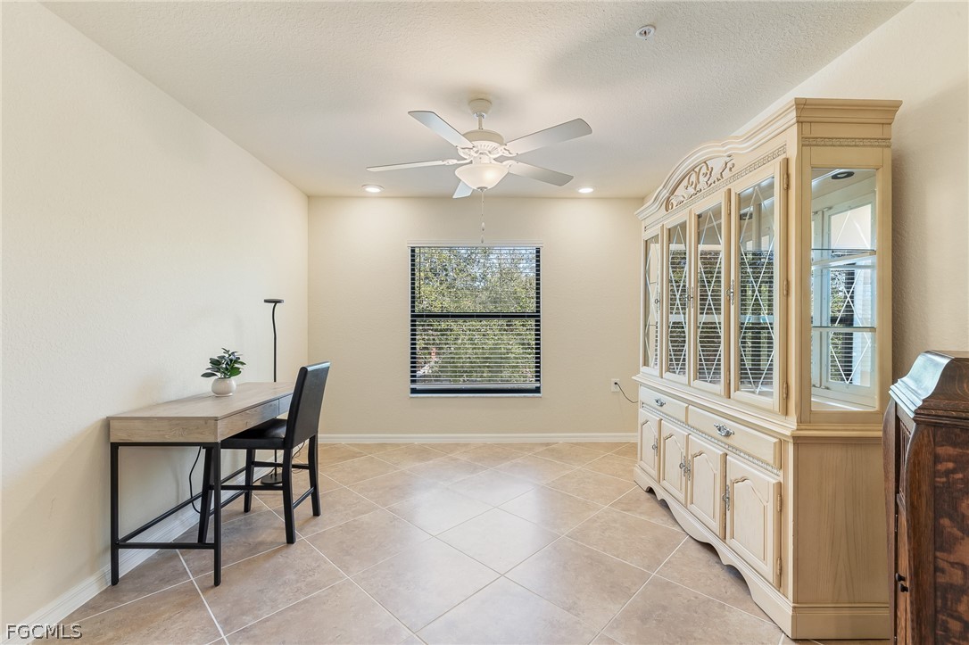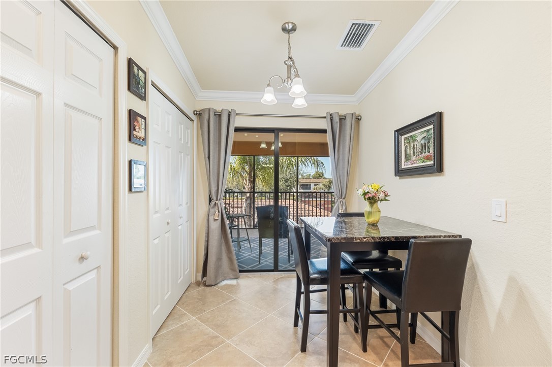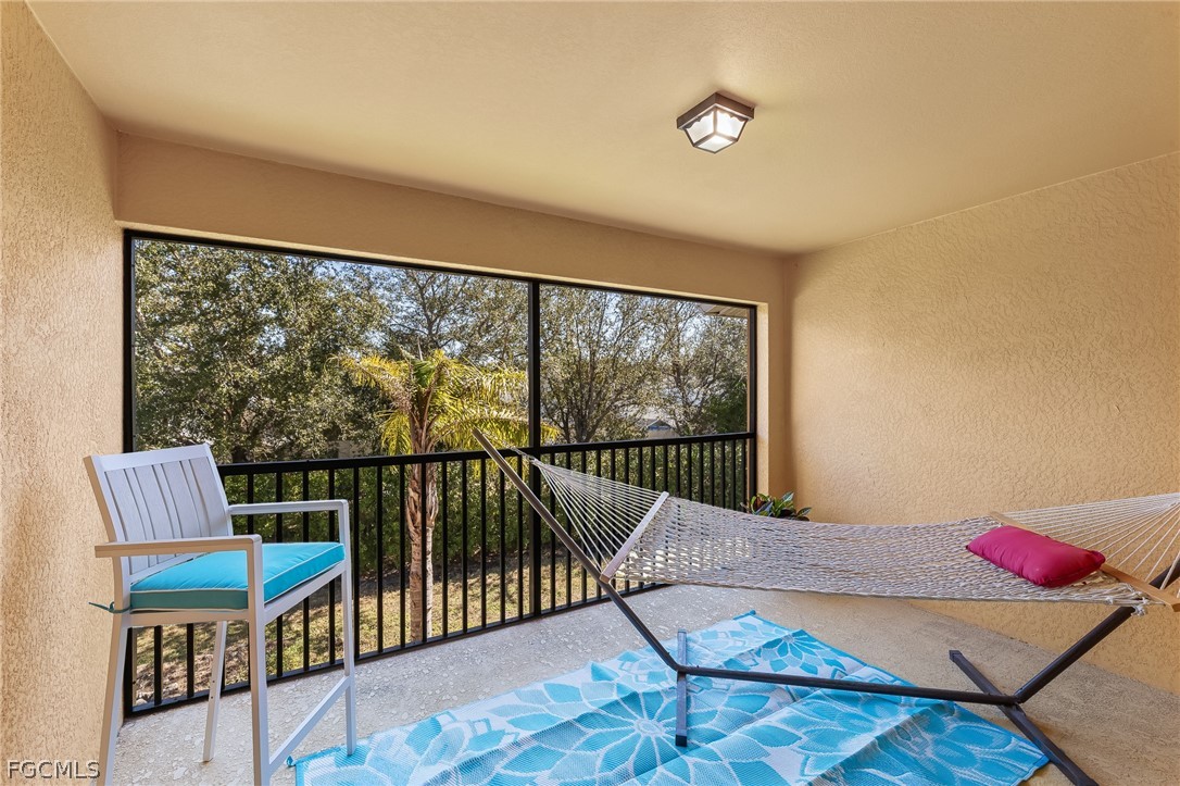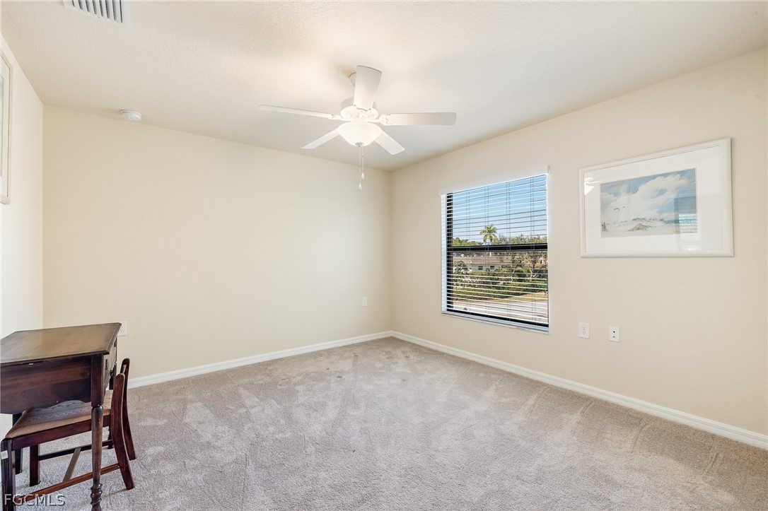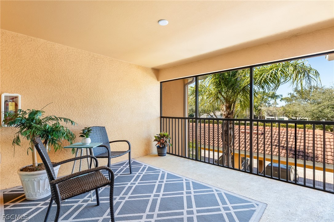 Lovely 2nd floor, end-unit condominium located in the newest section of Palmetto Cove built, a luxury condo community situated between McGregor Blvd and Summerlin Road off Cypress Lake Dr. Whether you work in the area or are a seasonal resident, this location is ideal getting to your Lee County workplace or our popular beach areas! Living on the second floor, this end unit allows for additional windows, vaulted ceilings and quieter living conditions. This unique condo features TWO screened-in lanais (top of stairs to unit & the lanai outside the living room)! This condo boasts 1556' of living space, including two bedrooms, PLUS a den/office, two full bathrooms and one assigned carport! There is plenty of extra guest parking to the left and back of the building. Well-designed kitchen with granite counter-tops, wood cabinets and stainless steel appliances, plus a pantry and breakfast nook with slider access to front lanai! The great room floorplan combines the dining and living area to one large room with a built-in dry bar, ceramic tile flooring, vaulted ceilings complemented with white crown molding. Primary bedroom at the back of the unit with tan carpet, faux wood blinds, crown molding and large bay window that allows for natural lighting. Primary bath features a tall, single vanity with dual sinks, walk-in shower and separate water closet. Tiled den with double pocket doors can be ideal for overnight guests or an in-home office! Second bedroom is also carpeted and equipped with the same ceiling fan/light fixture as the primary. Laundry closet is in-house with GE Washer & Dryer!