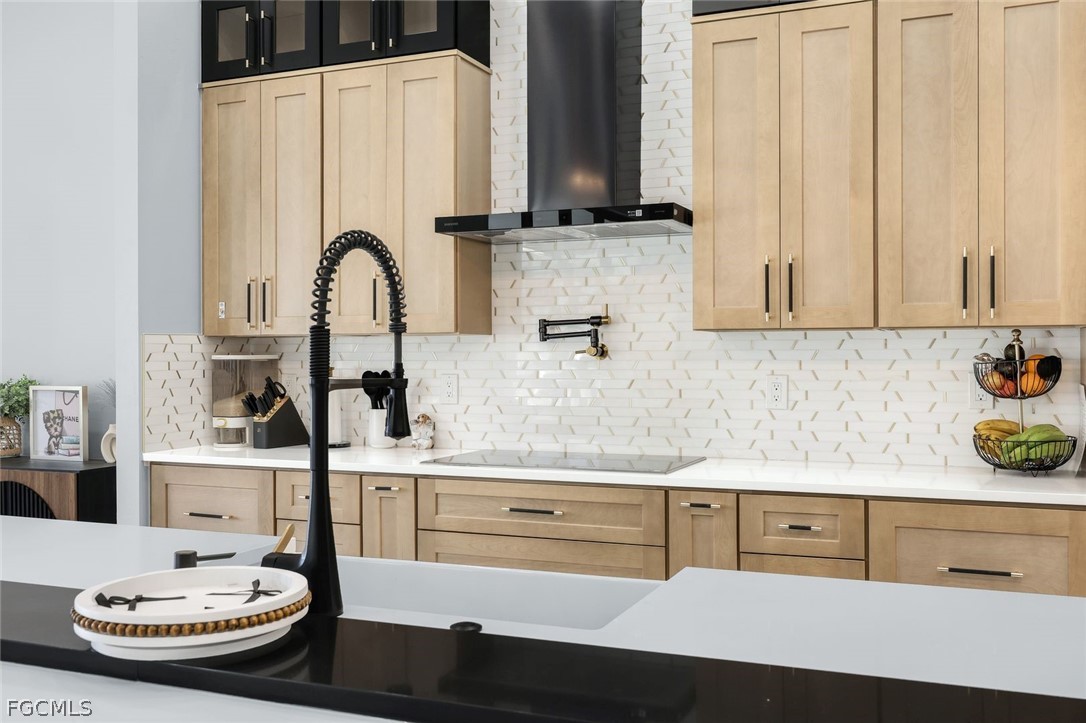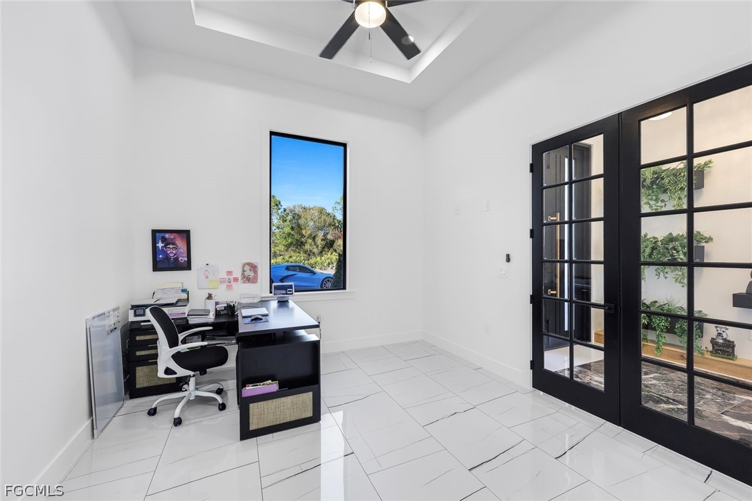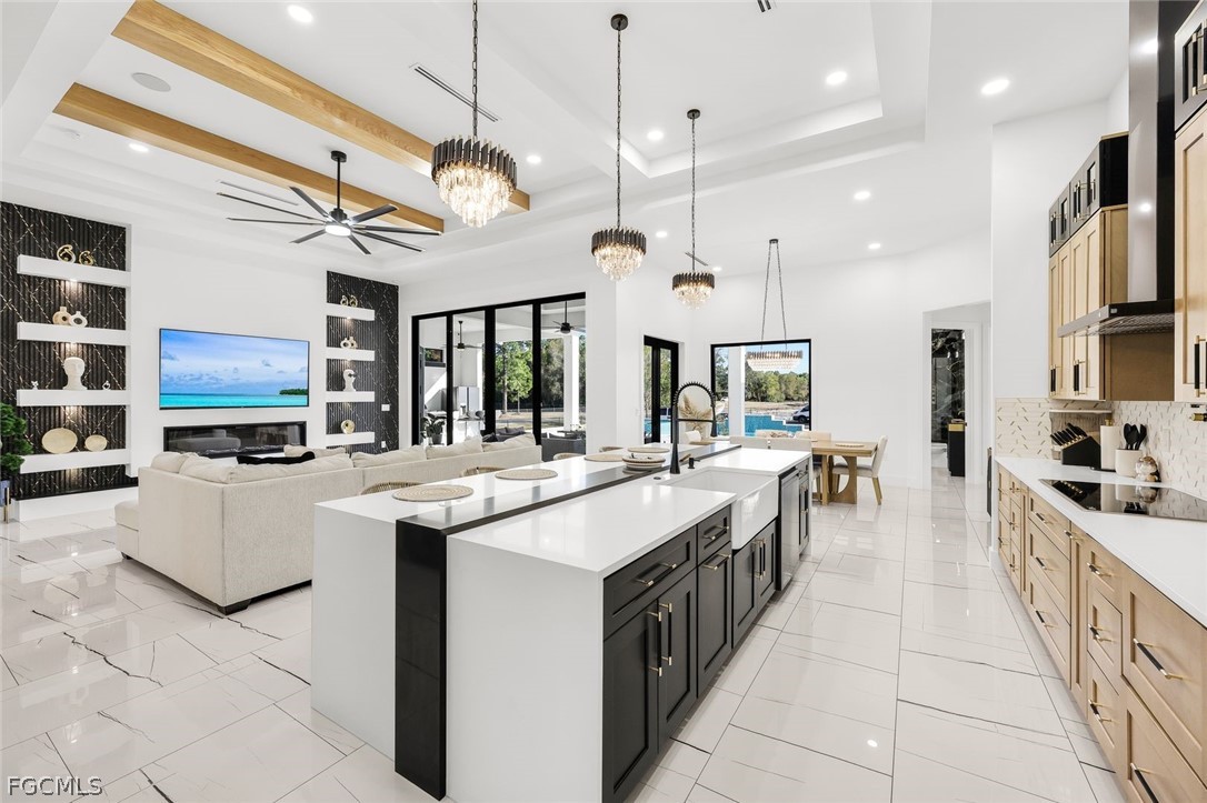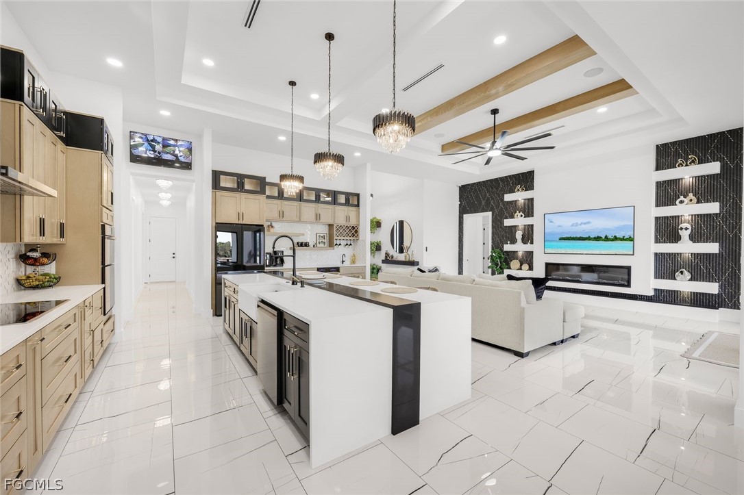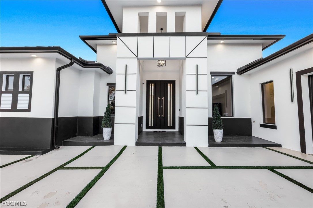 A striking arrival begins with a Miami-grass–style driveway and double entrance, complemented by custom oversized modern wood doors, a sleek metal roof, tray ceilings, and black accent features throughout.