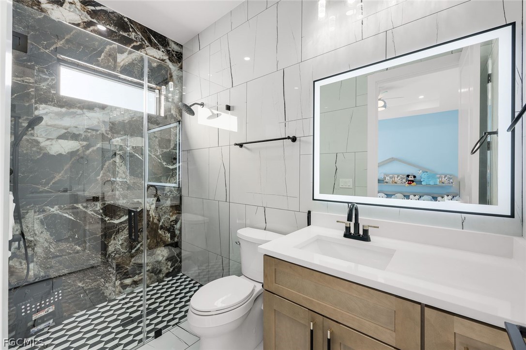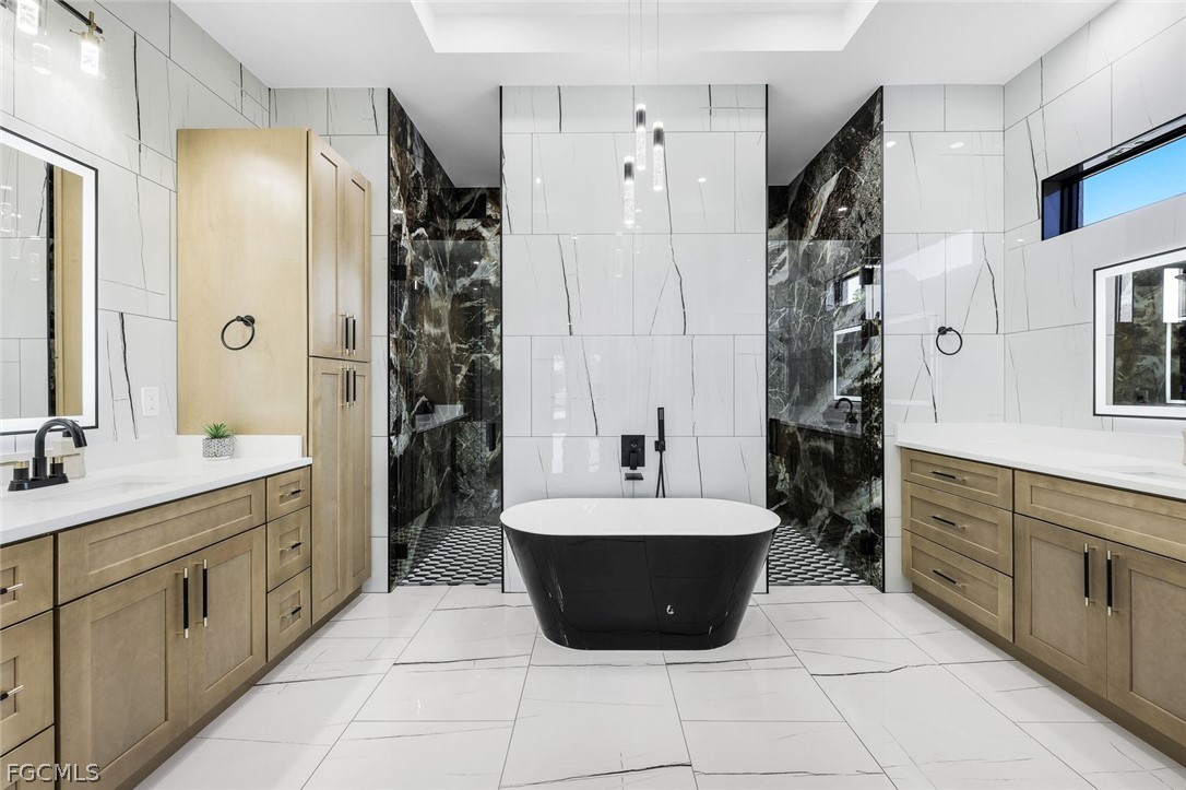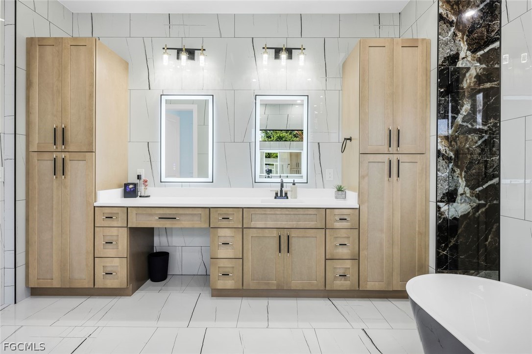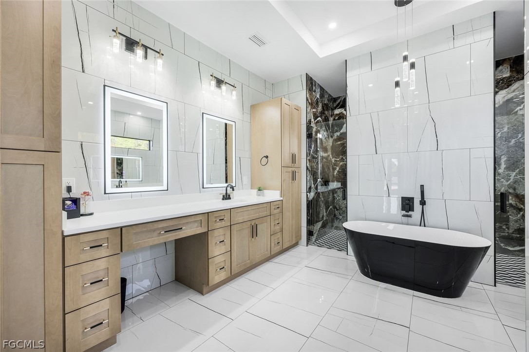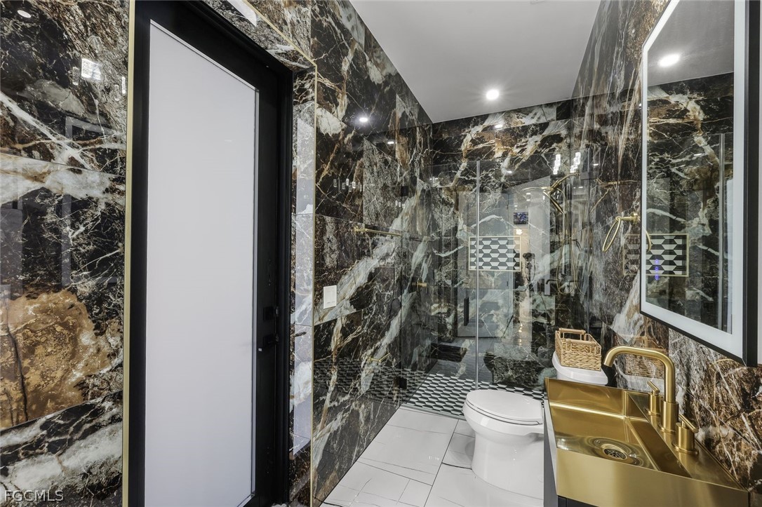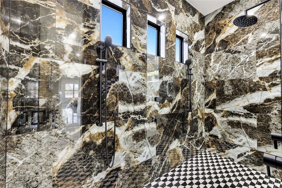 The primary suite features custom European-style cabinetry, a boho-inspired quartz vanity and statement shower, LED lighting, dual sinks, and spacious walk-in closets. All bedrooms offer en-suite bathrooms and walk-in closets, providing comfort and privacy throughout.