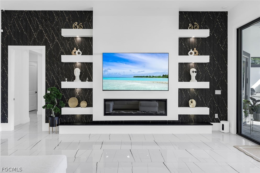 Interior highlights include porcelain tile flooring, a curated coffee bar, and a chef’s kitchen with top-of-the-line Samsung stainless-steel appliances.