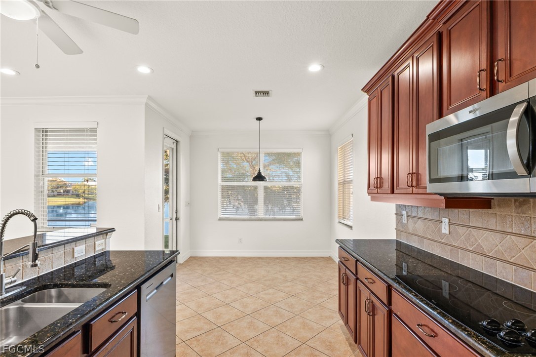 This spacious two-story home offering over 2,600 square feet of comfortable living space. This residence features 4 bedrooms and 2.5 baths, including a first-floor master suite with luxury vinyl plank flooring, a walk-in closet, dual sinks, a soaking tub, and a separate shower. The freshly painted interior boasts a living room with dramatic ceilings and abundant natural light. The eat-in kitchen overlooks a serene lakeside view and provides access to a screened rear lanai. The second floor offers 3 guest bedrooms, a full bath, and a loft area with new luxury vinyl plank flooring. Additional highlights include a first-floor laundry room, a half bath, and a recently upgraded HVAC system with a new thermostat. The home's prime location provides convenient access to nearby beaches, shopping, restaurants, schools, and medical facilities