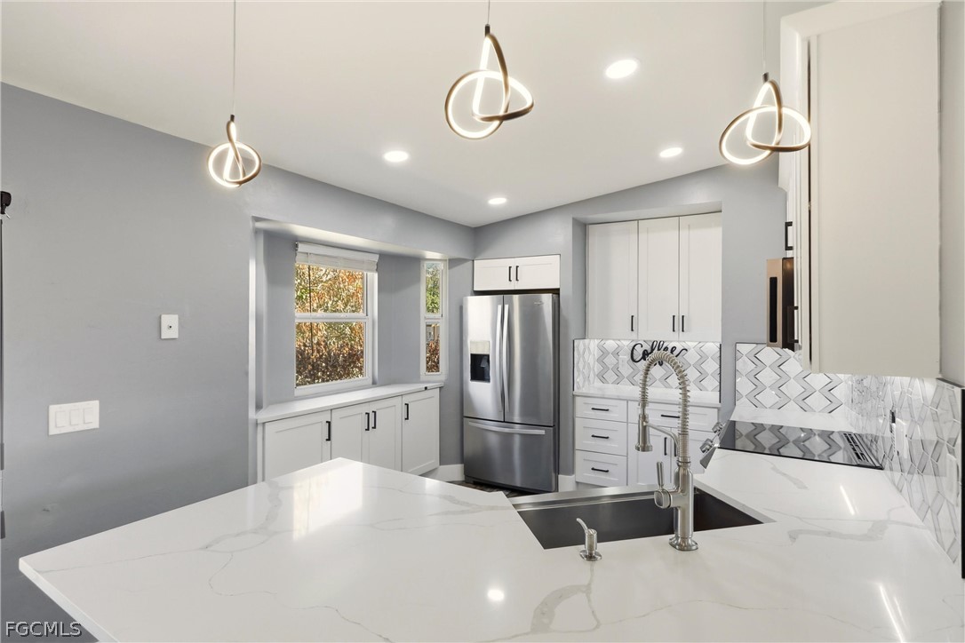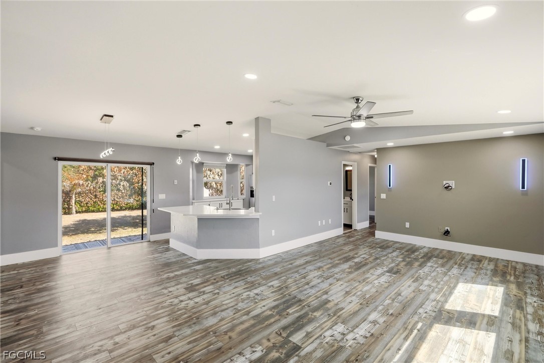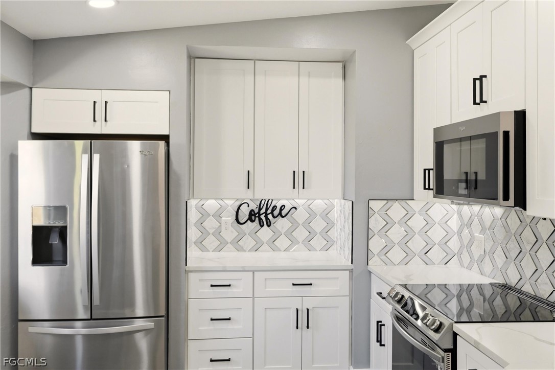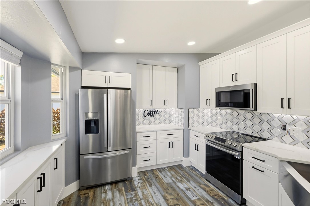 Featuring luxury vinyl plank flooring throughout, this home showcases a spacious open kitchen with quartz countertops, a stylish backsplash, shaker-style cabinets, and all-new stainless steel appliances. The large breakfast bar provides the perfect spot for casual dining, entertaining, or family gatherings.