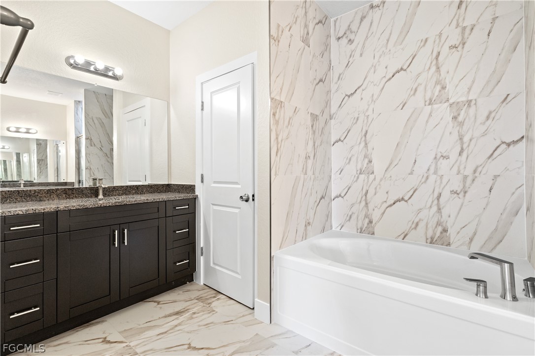 The private primary suite is tucked away from the other three bedrooms and features dual walk in closets. The primary bathroom offers a spacious soaking tub, a separate shower, and a dual vanity. Two secondary bedrooms share a convenient Jack and Jill bathroom, while the fourth bedroom includes its own en suite, providing comfort and privacy for guests.
