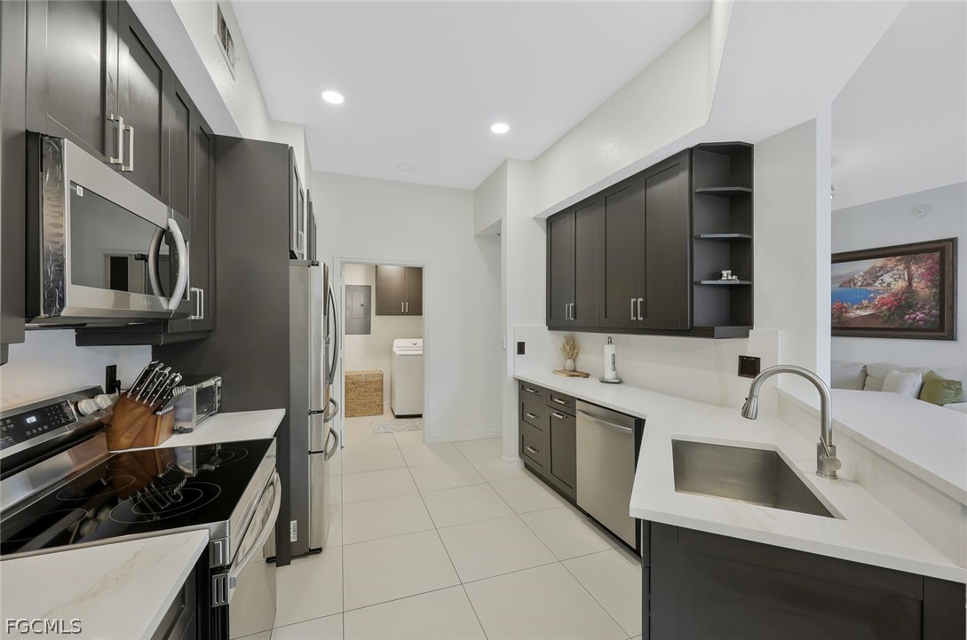 Welcome to Pebble Beach in the vibrant Laguna Lakes community—where style, comfort, and location come together beautifully! This rarely available, fully renovated 3-bedroom, 2-bath second-floor residence offers the perfect blend of modern elegance and easy Florida living. With abundant natural light and a spacious open-concept design, the layout flows effortlessly—ideal for entertaining friends or enjoying relaxed everyday living. Opportunities in Pebble Beach are few and far between, making this a true gem for buyers seeking something special. Thoughtfully updated from top to bottom, this home showcases contemporary finishes, updated cabinetry, sleek stainless steel appliances, and a fresh, modern color palette. The kitchen opens seamlessly into the main living area, creating a bright and welcoming space that feels both airy and inviting. The oversized primary suite is your private retreat, complete with a generous walk-in closet featuring custom built-ins. The en-suite bath offers dual sinks and a convenient step-in shower designed for comfort and ease. Two additional bedrooms provide flexibility for guests, a home office, or growing families. Step outside to your covered, screened lanai and unwind with peaceful breezes after a long day. It’s the perfect setting for morning coffee or evening relaxation. Laguna Lakes spans 154 acres of lush tropical landscaping with eight stocked lakes and an impressive lineup of resort-style amenities: heated pool and spa, kiddie pool, tennis, pickleball, volleyball, playground, fishing pier, and a large modern fitness center. Sidewalks line both sides of the streets, subtle night lighting lets you enjoy the stars, and recycled water supports the beautifully maintained grounds. Enjoy peace of mind with brand-new tile roofs (2022), fresh exterior paint (2023), fully funded reserves, and a community that did not flood during past hurricanes. HOA and condo fees include cable, high-speed fiber internet, water, building and flood insurance, exterior maintenance, professional management, and full access to amenities. All this just minutes from world-famous beaches, shopping, dining, and more. If you’re searching for a move-in-ready home in a gated, amenity-rich community near the Gulf, this is your opportunity. Schedule your private showing today—homes like this don’t stay available for long!