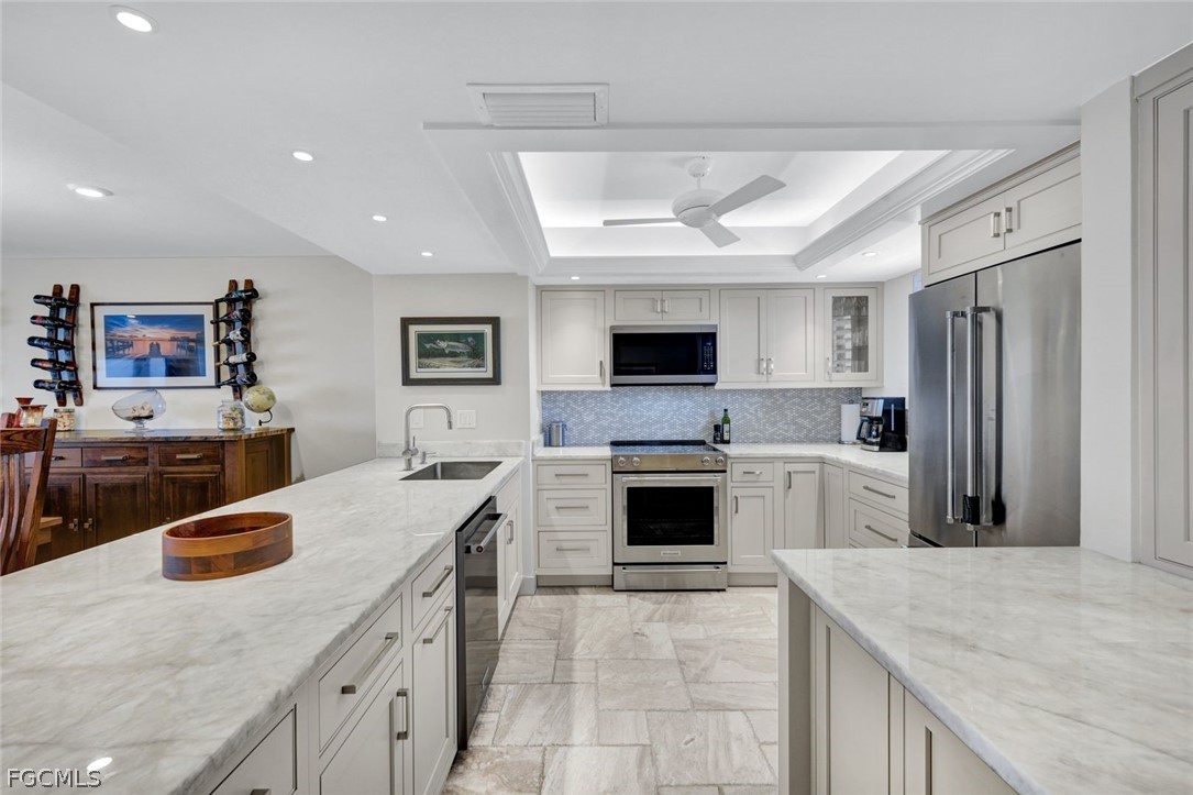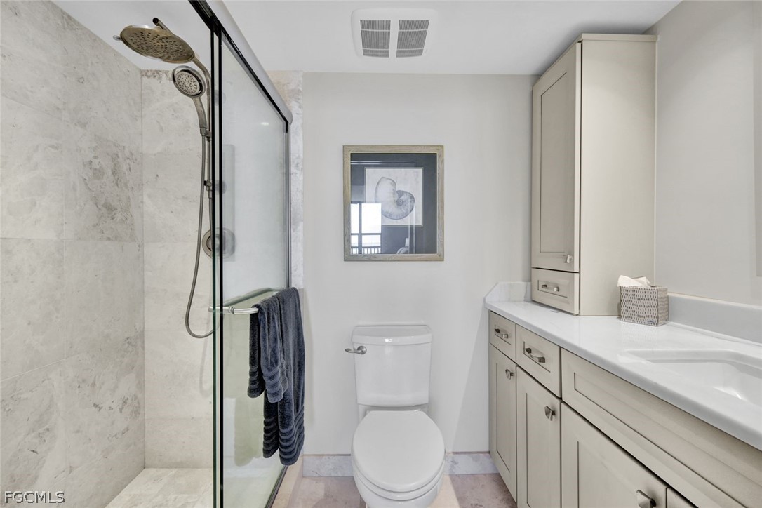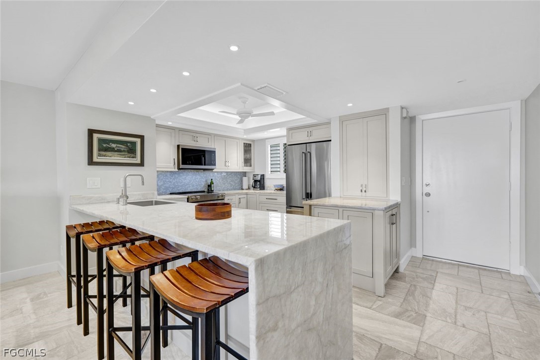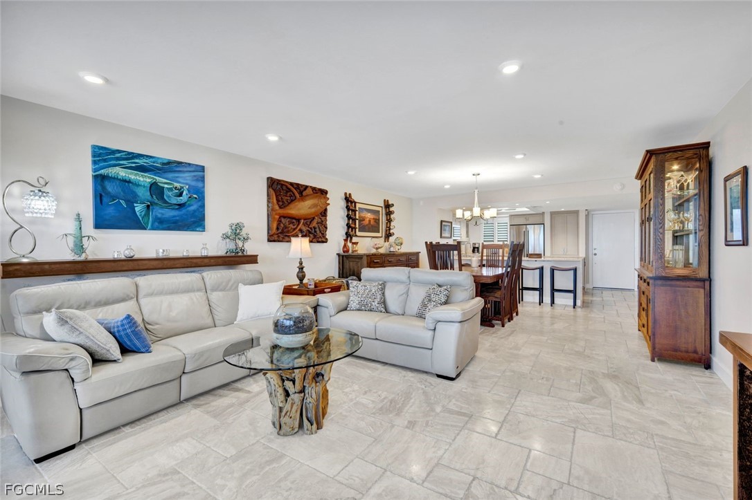 The condo showcases timeless luxury finishes, including elegant silver travertine marble flooring, a stunning kitchen with Cristallo Quartzite countertops and waterfall edge, a beautifully appointed primary bath featuring dual sinks with Lincoln Calcutta marble countertops, Vanilla Ice marble shower in the primary suite, Guest bathroom with Coral Reef shell stone countertops, Guest shower finished in Corinthian Fossil marble with a custom Wet Dog mural. The residence is offered partially furnished (excluding the dining room and artwork), making it easy to settle in and begin enjoying the coastal lifestyle.