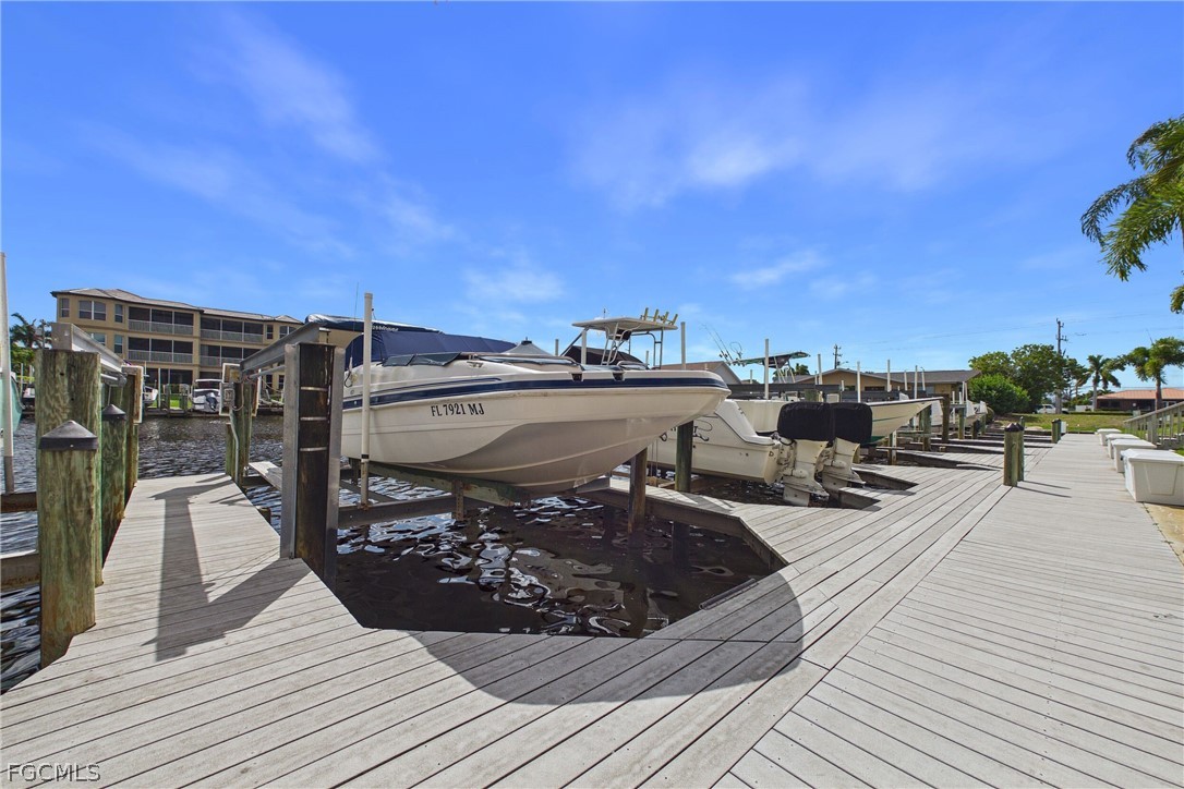 Welcome to your dream waterfront escape. This stunning ground floor condo, NO STEPS, boasting 3 spacious bedrooms, 2 full bathroom is a rare gem offering DIRECT GULF ACCESS with no bridges. Just a swift 7 minute ride to open water. As a serious boaters dream, the property includes a DEEDED BOAT DOCK with a 10,000 pound lift on a 200' canal. Perfect for launching adventures. Step inside to a bright expansive 30x30 great room that effortlessly opens to a private screened lanai via full wall pocket sliders, providing a seamless indoor outdoor flow. Thanks to its SOUTH facing exposure natural light bathes the space all day long. The serene primary suite offers peaceful water views, a generous layout and a private ensuite. The kitchen is spacious with coffered ceilings with abundant cabinetry, counter space and a large breakfast bar ideal for gathering. Just outside a resort style pool awaits, creating a tranquil oasis, also an oversized tiki hut for lazy days enjoying the best of Cape Coral living. Unique to this home, you have a private front door entrance, no crowded hallways or guest foot traffic- and an attached garage just steps from your front door. PLUS you will enjoy one of the lowest HOA fees on Beach Pkwy for a condo of this size- an exceptional value. Recent improvements include a NEW ROOF and storm shutters on the south side. Ideally located new Jaycee Park and just minutes from downtown Cape Coral's vibrant dining shopping and night life, this home is perfect for either year round living or seasonal escapes. Don't miss your chance schedule your private showing today and turn your waterfront dream in to a reality. With a wet bar, wine fridge and built in blender there is no need to leave this gem! This home is priced to sell! No need to look any further, this home has it all!