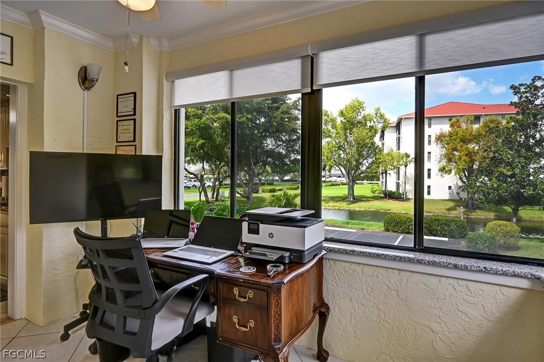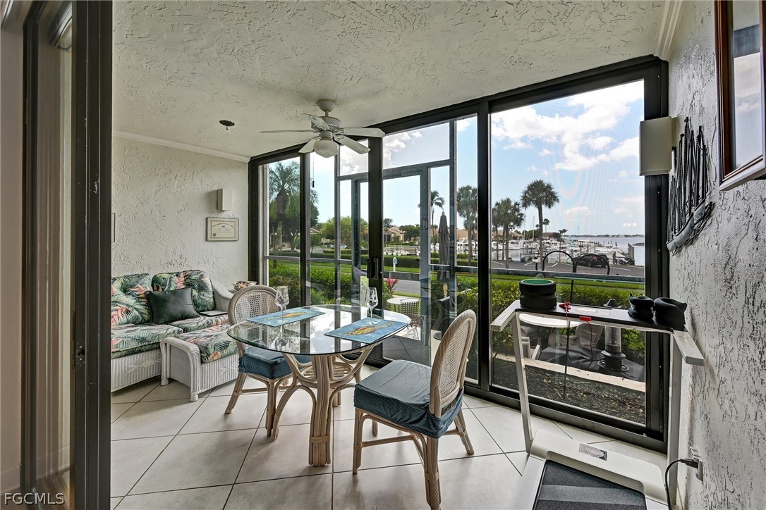 THIS ANNUAL LISTING is located on the first floor walk-out corner unit with lots of sun and terrific views! Enjoy AMAZING Sunsets from the screened lanai and the open patio, overlooking the river and Gulf-access marina. Updated kitchen and baths, bonus room with a pool and lake view, storm protection, and an under-building parking spot. The Landings Yacht Golf and Tennis Club is one of the most prestigious gated communities off historic McGregor Blvd, close to beaches, restaurants, arts & entertainment. Enjoy included amenities for two: unlimited golf, tennis, pickleball, bocce, two dining venues with daily specials and happy hour, social clubs, swimming, fitness center and more - come live the good life! A boat slip is included, too, based on wait list, or take out the rental boat!! AVAILABLE MAY 1ST 2026