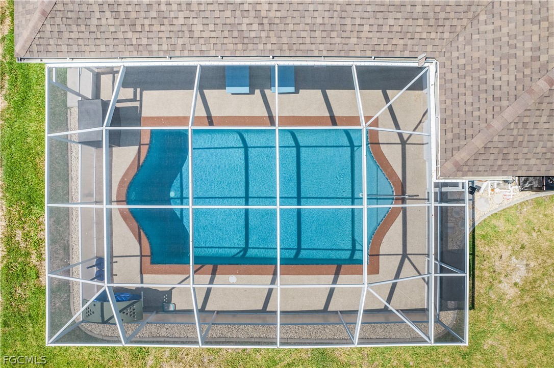 Fully SCREENED-IN lanai with lots of lounge chairs, outdoor eating spaces, BBQ grill and a passthrough window to kitchen, making this the PERFECT place to keep the party going outside!