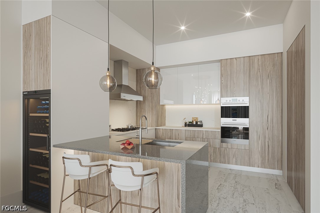 A chef-inspired kitchen anchors the home, featuring premium appliances and gas cooktop, European-style cabinetry, a wine cooler and a statement island.