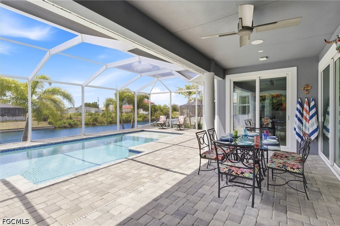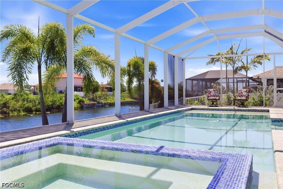 Stunning custom built southern exposure waterfront pool home completed in 2022, offering modern design, quality finishes, and approximately $96,000 in upgrades completed in 2025–2026. This 3 bedroom, 2 bath residence features an open great room floor plan, impact resistant windows and doors, and seamless indoor-outdoor living. The spacious gourmet kitchen is the centerpiece of the home, showcasing quartz countertops, a waterfall island, LG Signature induction cooktop, LG Studio wall oven and speed oven, LG Studio range hood, Bosch dishwasher, custom cabinetry, and kitchen reverse osmosis water purification. The bright main living area opens through impact sliders to the screened lanai, creating an ideal setting for entertaining and everyday Florida living. Step outside to your own private waterfront retreat featuring a heated saltwater pool and spa, expansive screened lanai, freshly cleaned, sanded, and sealed pavers, and beautifully enhanced tropical landscaping with newly installed palm trees and garden plantings. The privacy fenced yard creates a rare sense of seclusion and security, offering an ideal space for pets, outdoor enjoyment, and peaceful relaxation while still taking full advantage of the waterfront setting. Added irrigation and drainage systems, along with pool overflow and water softener drain line improvements, make the exterior as functional as it is attractive. Freshwater canal views and a seawall complete the outdoor appeal. Inside, this smartly upgraded home includes Sonos speakers in 3 zones, wiring for 5.1 surround sound in the living room, custom lighting, whole-house 2-inch custom blinds, monitored alarm protection for all windows and doors, security cameras, HVAC soft start with UV air purification, and a whole-house generator with a 100-gallon propane tank. Smart home app access integrates the alarm system, lighting, Sonos, Rainbird irrigation, Pentair pool controls, lanai Wi-Fi, and kitchen and laundry appliances for added convenience and peace of mind. The laundry room is equipped with a washer, dryer, laundry sink and offers abundant cabinet space for storage. Fresh paint in the bedrooms, baths, and at the front door adds to the move-in-ready appeal. Set on a freshwater canal lot with no HOA fees, this exceptional property blends modern comfort, thoughtful upgrades, privacy, and waterfront lifestyle in one beautifully maintained Cape Coral home.