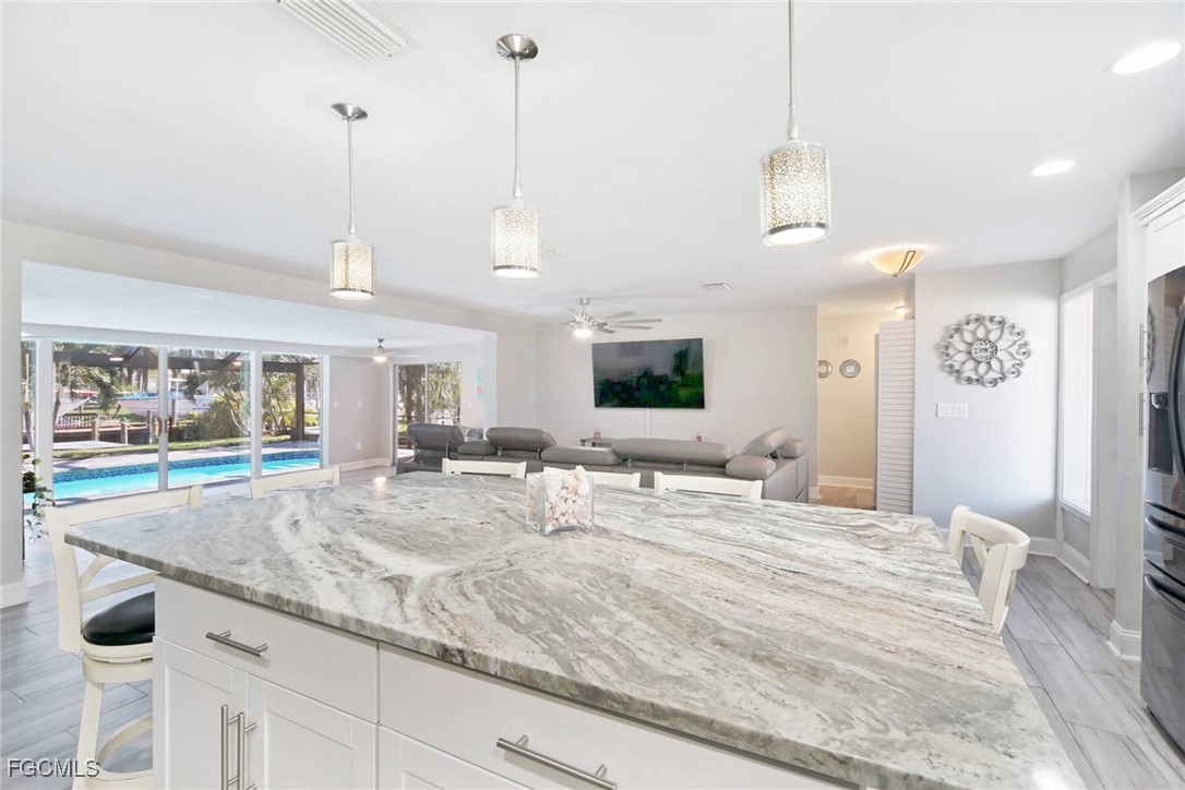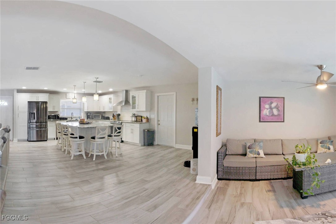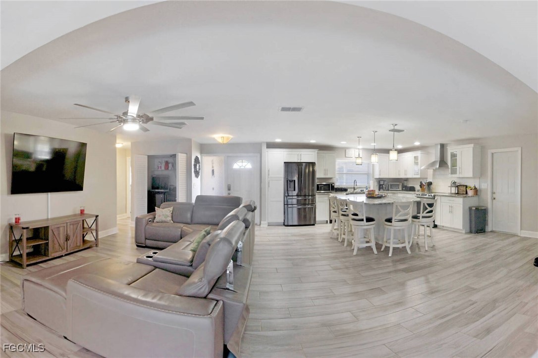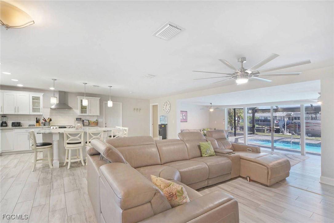 Turn Key/Located what soon will be new yacht club area rebuild coming. Enter home with view across pool area to canal and boat dock. Beautiful kitchen with Shaker white cabinets and center island for your gatherings. Screened pool area with covered Lani area. Completely updated Home 3 Bed 2 Bath, Heated pool Home Updates include pool heater, pool surface, Pool cage, pool equipment , AC and Boat dock with 30k Lift. No bridge/Sail boat access to the Caloosahatchee river, South to Gulf of Mexico, North to Lake Okeechobee. Ready for new owners of this waterfront Paradise.
