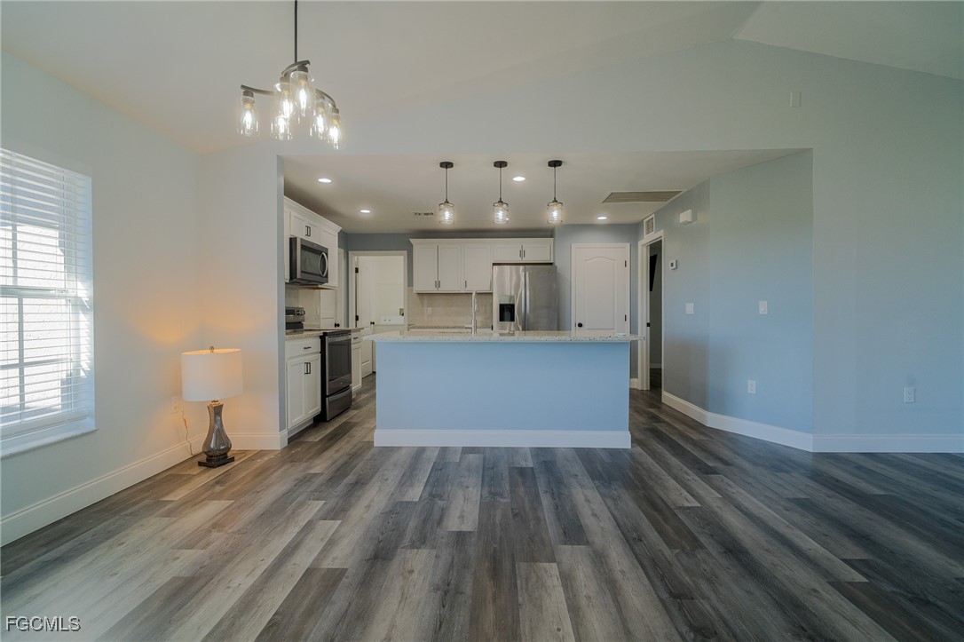 Beautiful 3-bedroom, 2-bath home in NW Cape Coral. Open and bright floor plan with a sleek modern fireplace, updated kitchen featuring white cabinetry, granite countertops, stainless steel appliances, and a large island. Renovated bathrooms and elegant plank flooring throughout. Includes a 2-car garage. Move-in ready and conveniently located near shopping, dining, and the growing NW Cape area.