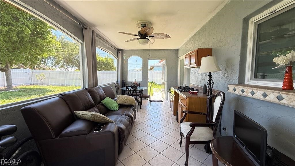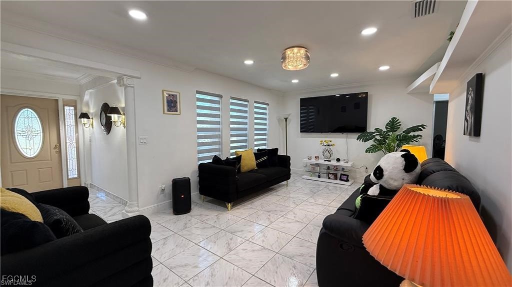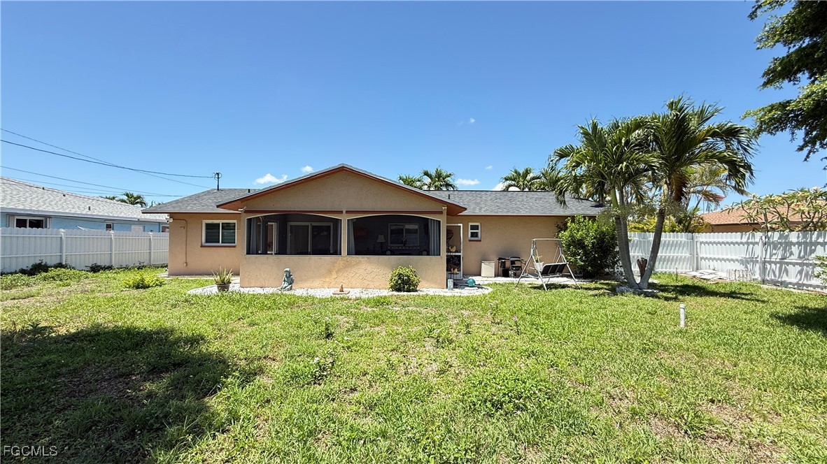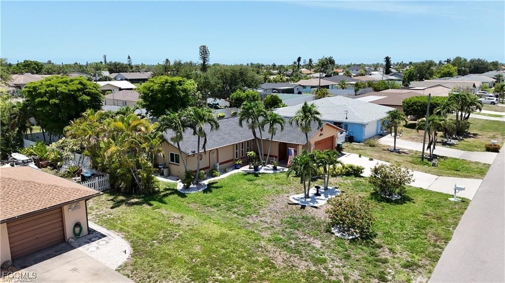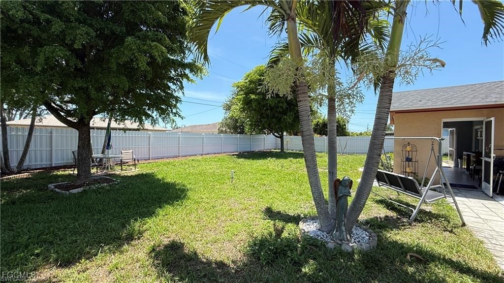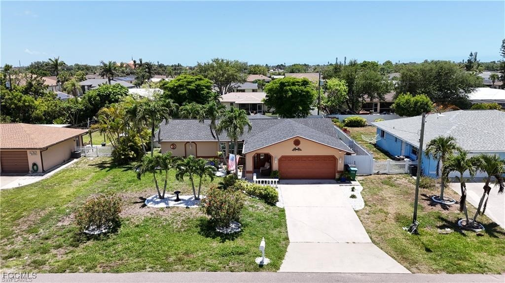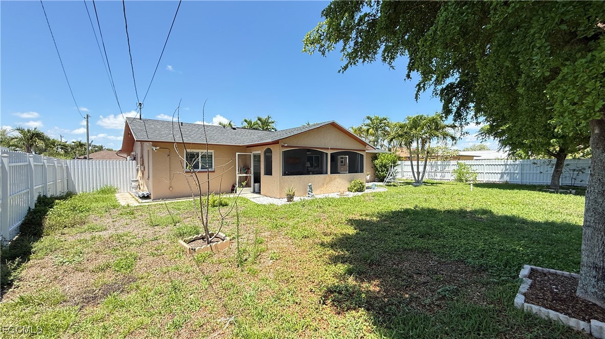 Welcome to this beautifully updated home located in one of Cape Coral’s most desirable neighborhoods, just minutes from Downtown, top-rated schools, fitness centers, shopping, dining, and beaches. This property Surrounded by different beautiful types of palm trees, and the outdoor space offers a true taste of Florida living, this home offers unparalleled convenience and lifestyle. This property is Not in a FEMA AE Flood Zone and has city utility assessments fully paid. Recent upgrades include a new roof (2023), new fencing (2023), impact doors and windows (2020), central A/C (2014) and a new water heater (2024).The home boasts modern finishes throughout, crown molding, elegant porcelain and wood flooring, TV is staying, and stainless steel appliances (excluding the dishwasher is not working).The lanai is fully screened, featuring a spacious layout and a mini outdoor kitchen, perfect for entertaining. The expansive, newly fenced backyard (2023) offers ample space for a pool, creating your own private oasis. Don't miss the opportunity to own this move-in-ready home that combines comfort, location, and potential.