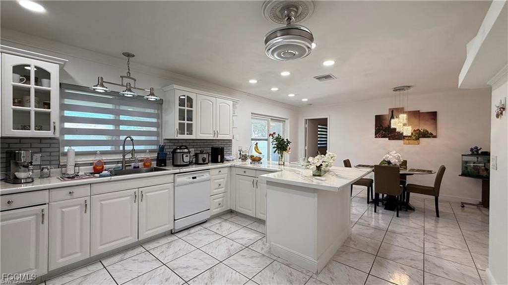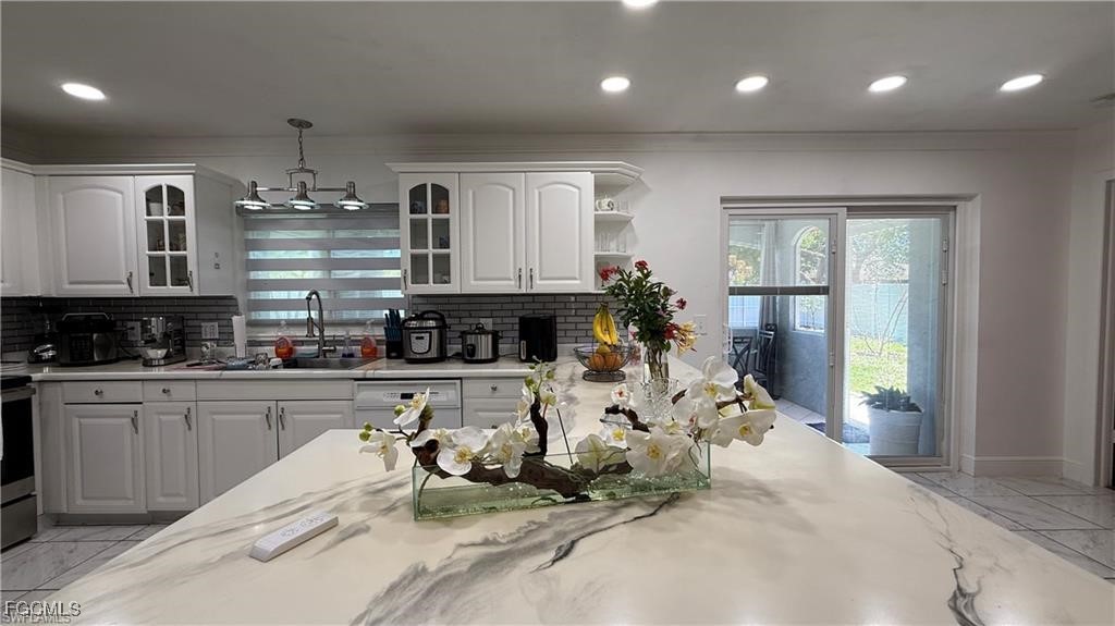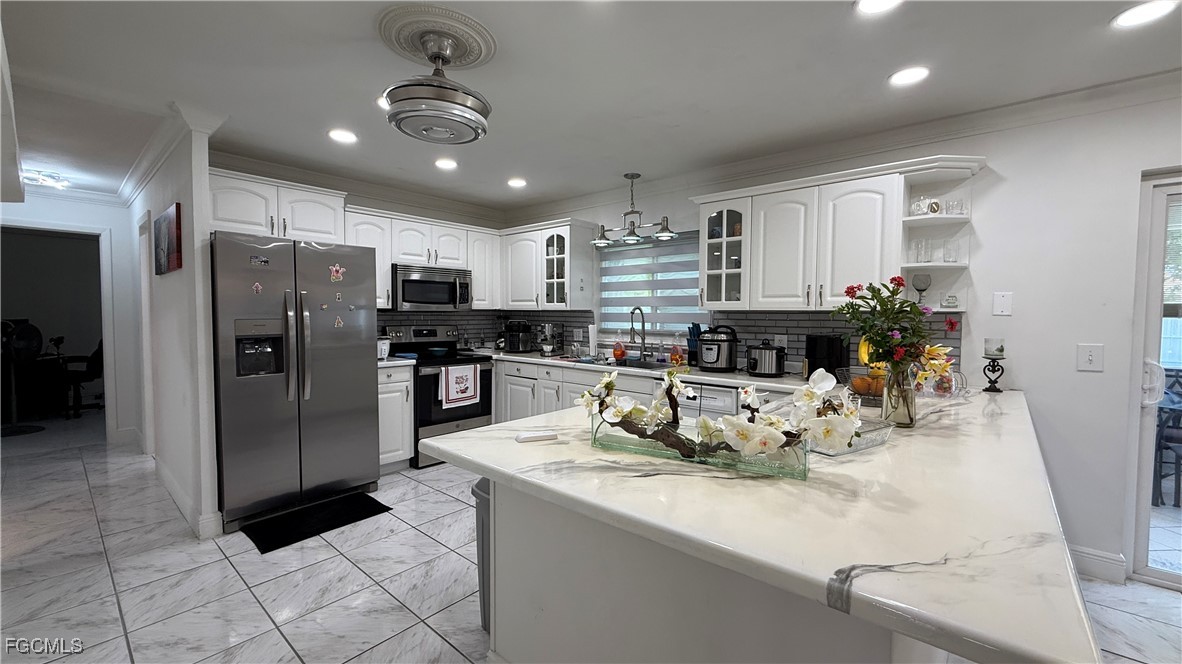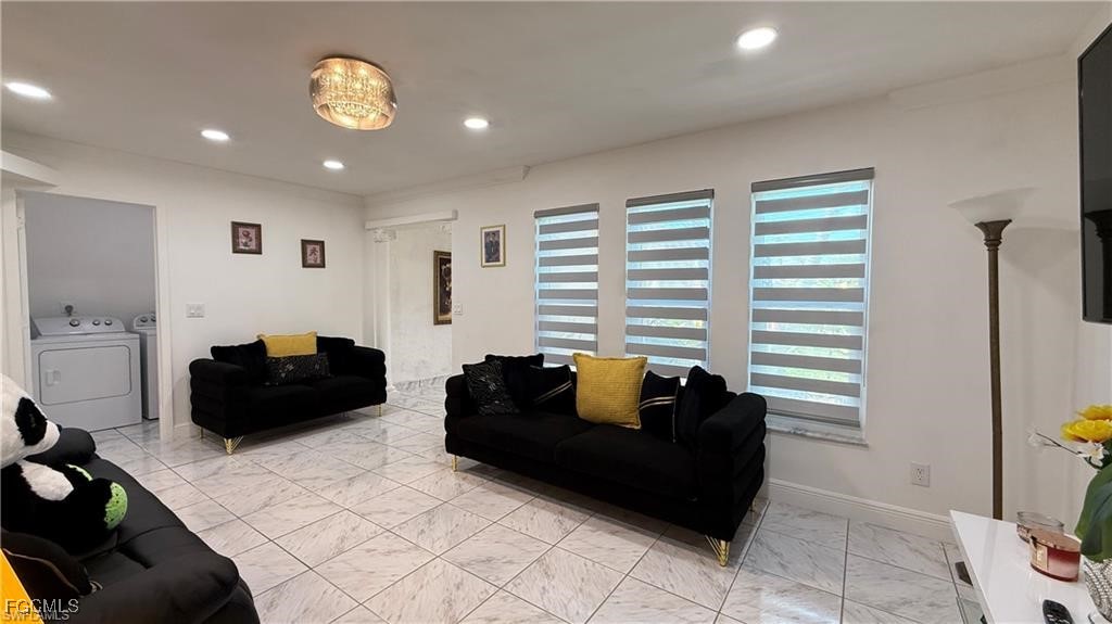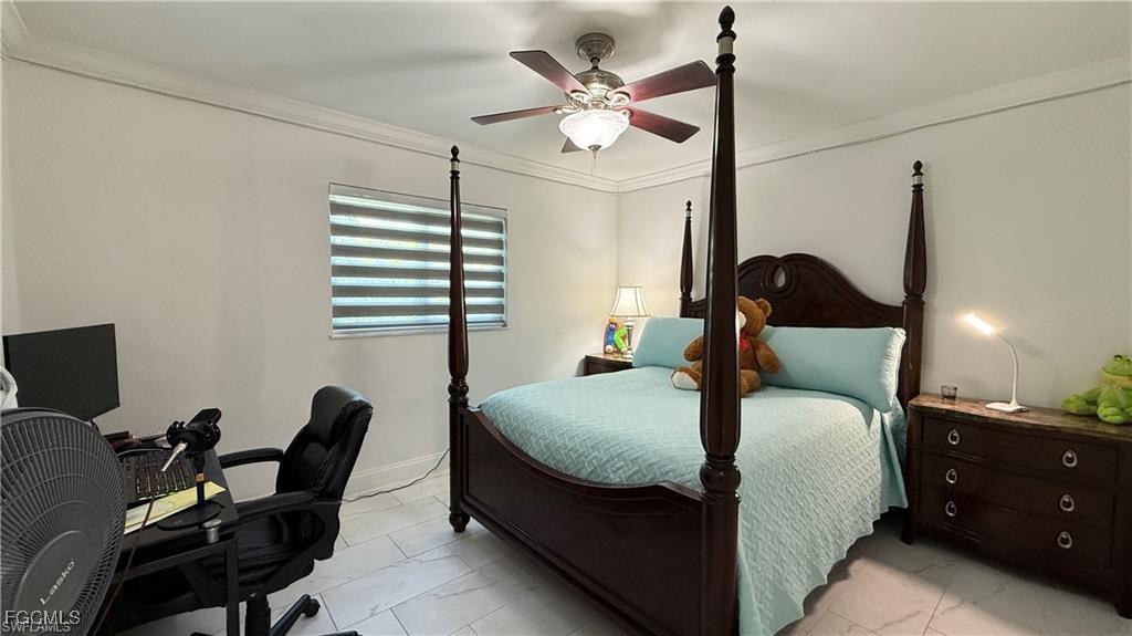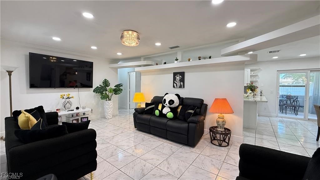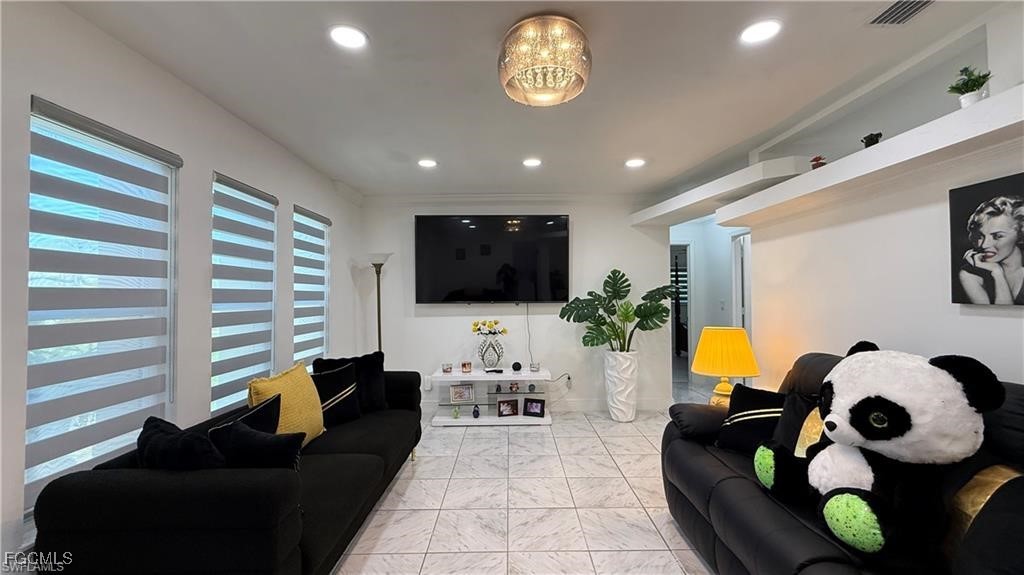 Welcome to this beautifully updated home located in one of Cape Coral’s most desirable neighborhoods, just minutes from Downtown, top-rated schools, fitness centers, shopping, dining, and beaches. This property Surrounded by different beautiful types of palm trees, and the outdoor space offers a true taste of Florida living, this home offers unparalleled convenience and lifestyle. This property is Not in a FEMA AE Flood Zone and has city utility assessments fully paid. Recent upgrades include a new roof (2023), new fencing (2023), impact doors and windows (2020), central A/C (2014) and a new water heater (2024).The home boasts modern finishes throughout, crown molding, elegant porcelain and wood flooring, TV is staying, and stainless steel appliances (excluding the dishwasher is not working).The lanai is fully screened, featuring a spacious layout and a mini outdoor kitchen, perfect for entertaining. The expansive, newly fenced backyard (2023) offers ample space for a pool, creating your own private oasis. Don't miss the opportunity to own this move-in-ready home that combines comfort, location, and potential.