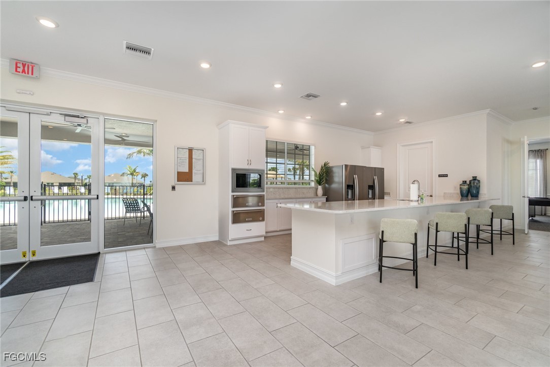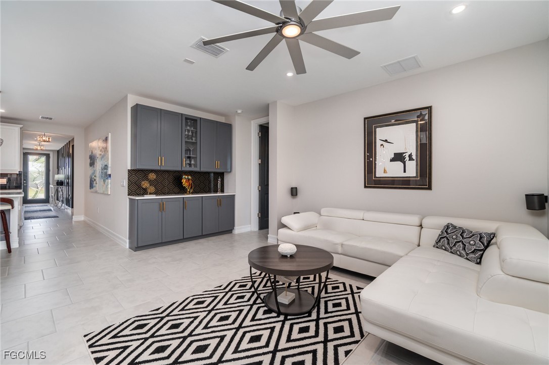 The spacious gathering room features a custom built-in fireplace wall, offering the perfect spot to unwind. At the heart of the home, the gourmet kitchen will impress any chef with its oversized island with bar seating, quartz countertops, sleek contemporary backsplash, walk-in custom built pantry, and all-new upgraded appliances. An added built-in dry bar enhances the space, adding sophistication for hosting guests with ease.