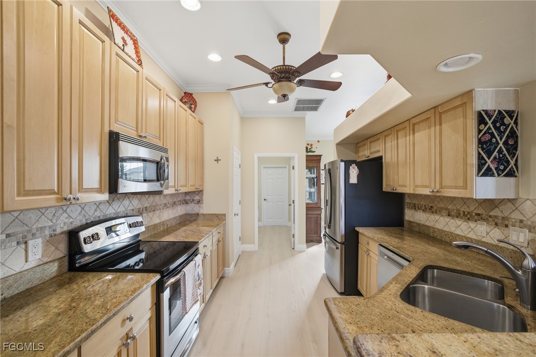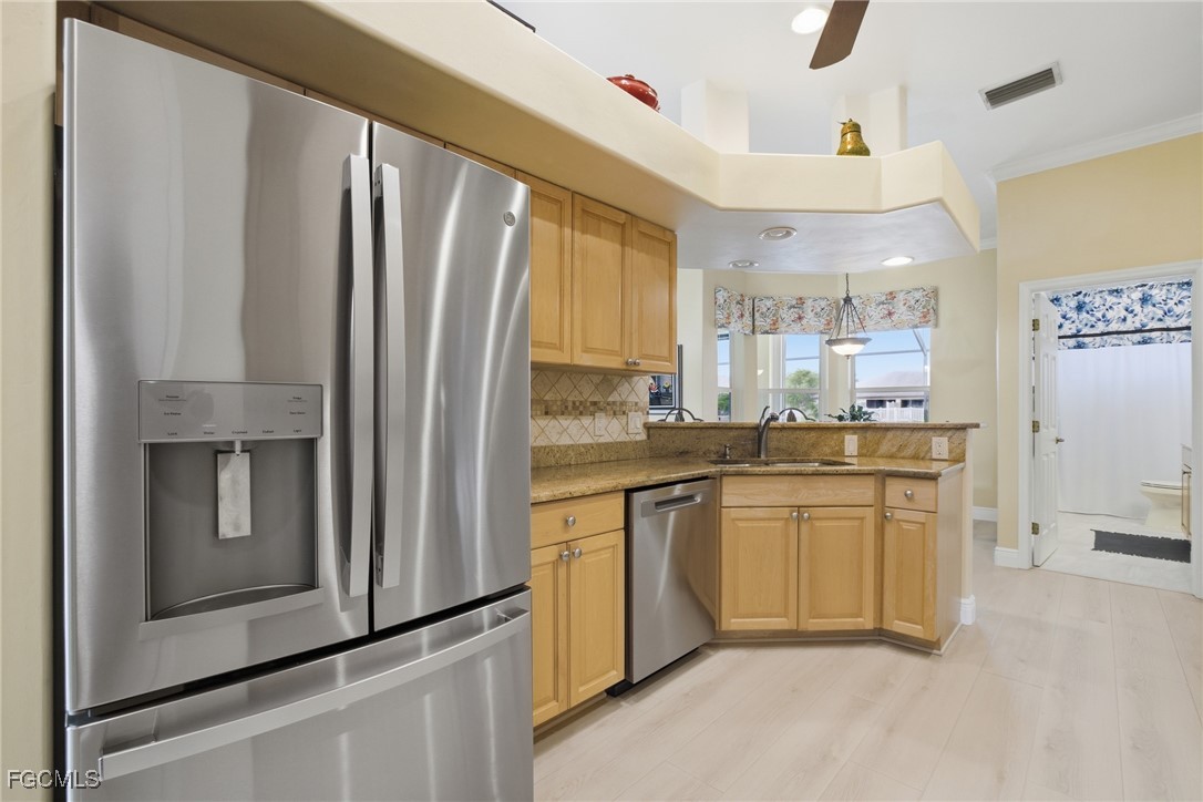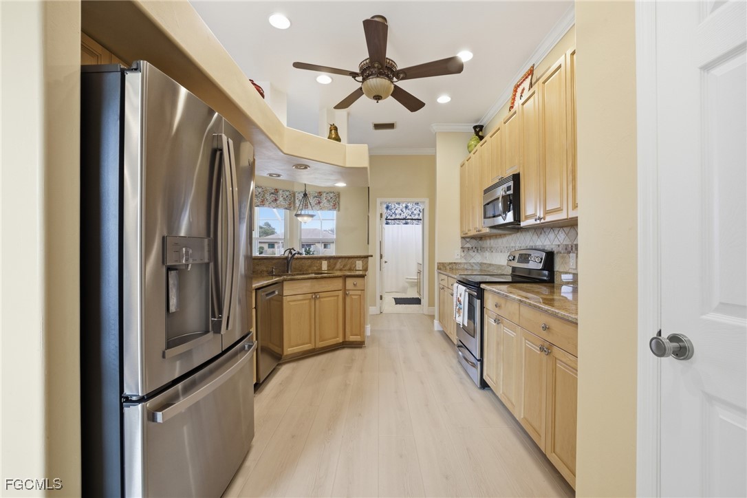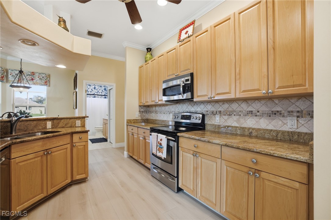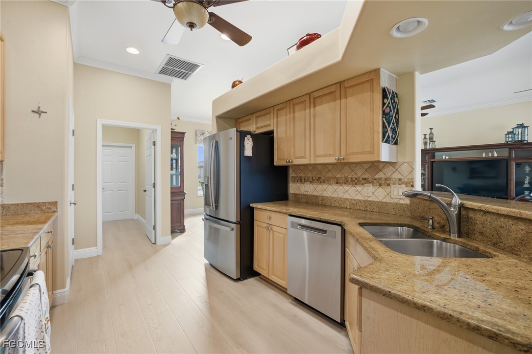 Pride of ownership shines bright on this 3/2/2+ home. As you walk in through your double door entry you are welcomed with an open floorplan that leads out to your beautiful heated, salt water pool and view of your fresh water canal...perfect for fishing, kayaking, boating and more that Florida has to offer. Inside has easy to maintain vinyl floors throughout and tile in the bathrooms. Granite countertops, real wood cabinets with pull-out shelves for your convenience. Crown molding and larger updated baseboards add an upscale touch. All bedrooms include walk-in closets for extra storage and oversized garage has plenty of space for workbench, lawn equipment, and 2 cars. Accordion hurricane shutters on all windows and a circular driveway adds even more conveniences for the new owner. Saltwater pool also has colored lights for ambience and electric heater for comfort. The exterior of the home has just been painted and there are security cameras for safety. Roof and A/C have been replaced in past couple of years. This wonderfully maintained home is also close to the hospital, restaurants, shopping, police and fire rescue. Assessments paid and not in a flood zone.