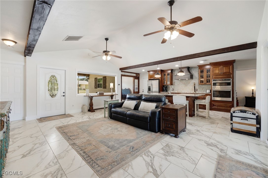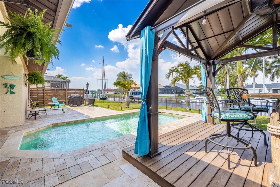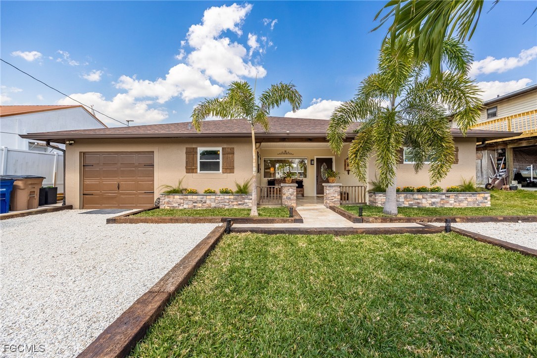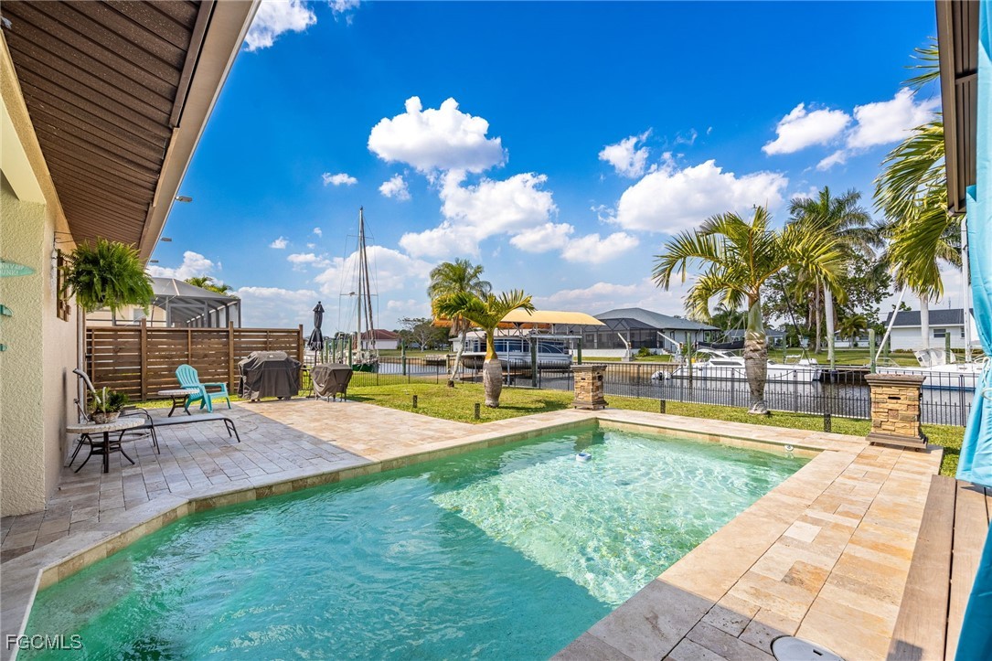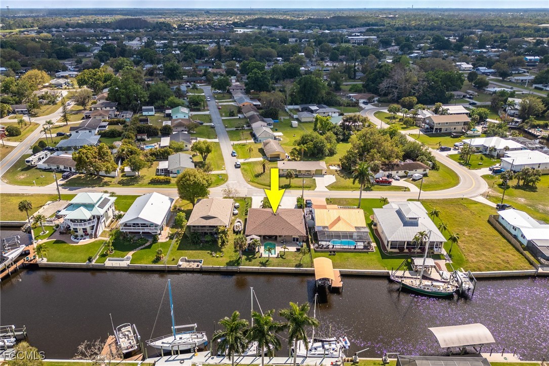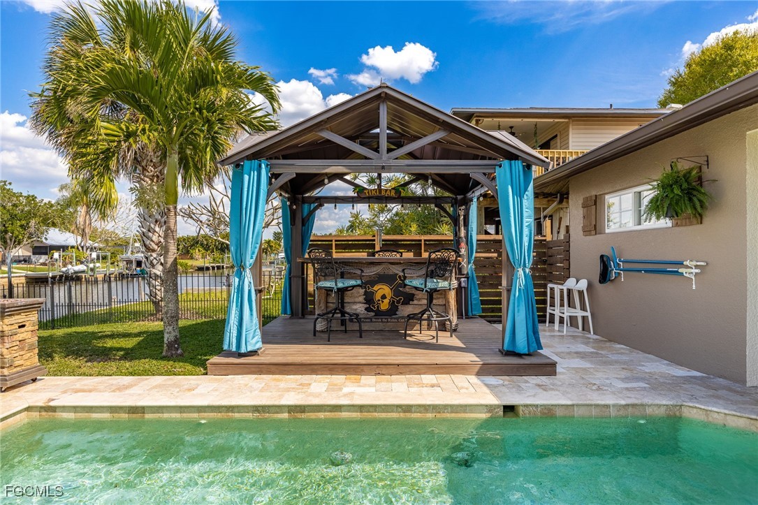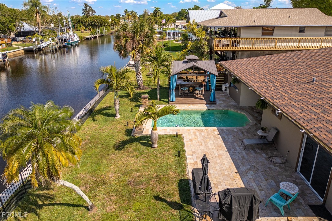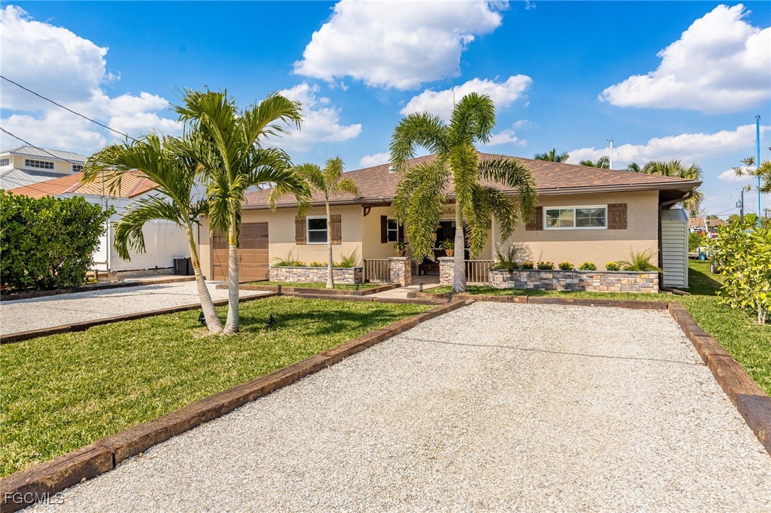 Charming & Fully Renovated Direct Access Pool Home with Tons of Character! Welcome to this beautifully updated 4 bedroom, 2 bathroom home that perfectly blends charm, elegance and modern convenience. From the moment you arrive, you'll be captivated by the great curb appeal and a cozy front porch inviting you to step inside. The spacious great room boasts a stunning cathedral ceiling with wood beams and stained glass accents, creating a warm and welcoming ambiance. Tile floors flow throughout the home enhancing both style and durability. The heart of the home is the gorgeous, upgraded kitchen, featuring wood cabinets, granite countertops, a large island, a cooktop range with an eye-catching range hood and a built-in wall oven with microwave ~ perfect for cooking and entertaining. The formal dining room is equally impressive, showcasing wooden arches with decorative glass that add a touch of sophistication. Retreat to the private primary suite, accessed through a lovely wooden door with an elegant glass insert. Inside you'll find a spacious walk-in closet and a beautifully designed en suite bathroom with direct access to the patio and pool. The home also offers three additional bedrooms and an updated guest bathroom with a stylish barn door. Step outside through the sliding glass doors to enjoy your private outdoor oasis with a covered lanai, fenced yard, sparkling pool, outdoor shower, a pergola with string lights and an awesome tiki bar! Situated on a tranquil, direct-access canal ~ just minutes to the Caloosahatchee River, this home offers a serene waterfront lifestyle. The garage features a laundry area with a front loading washer & dryer that completes this exceptional property. You will have peace of mind with a newer roof (August 2021), newer A/C system (2019), the home was replumbed, has a new electrical system, tankless water heater, newer seawall & new flood barriers. Don't miss this opportunity to own a truly one-of-a-kind home that exudes character and charm while offering modern upgrades and a fantastic outdoor space!