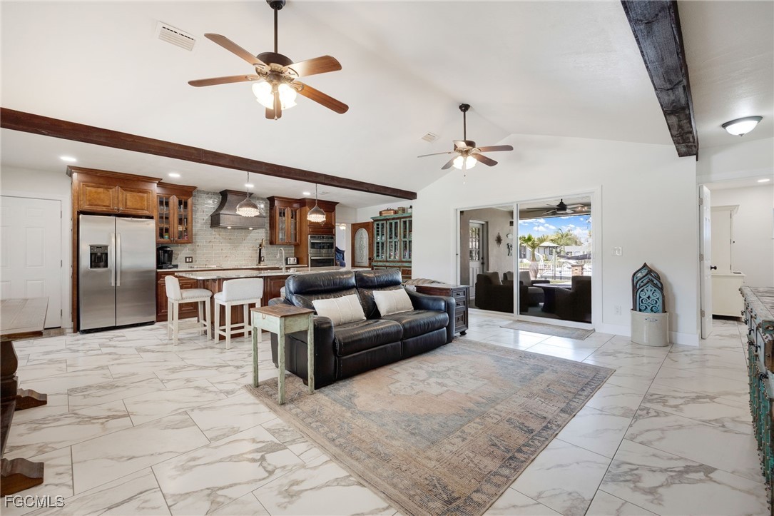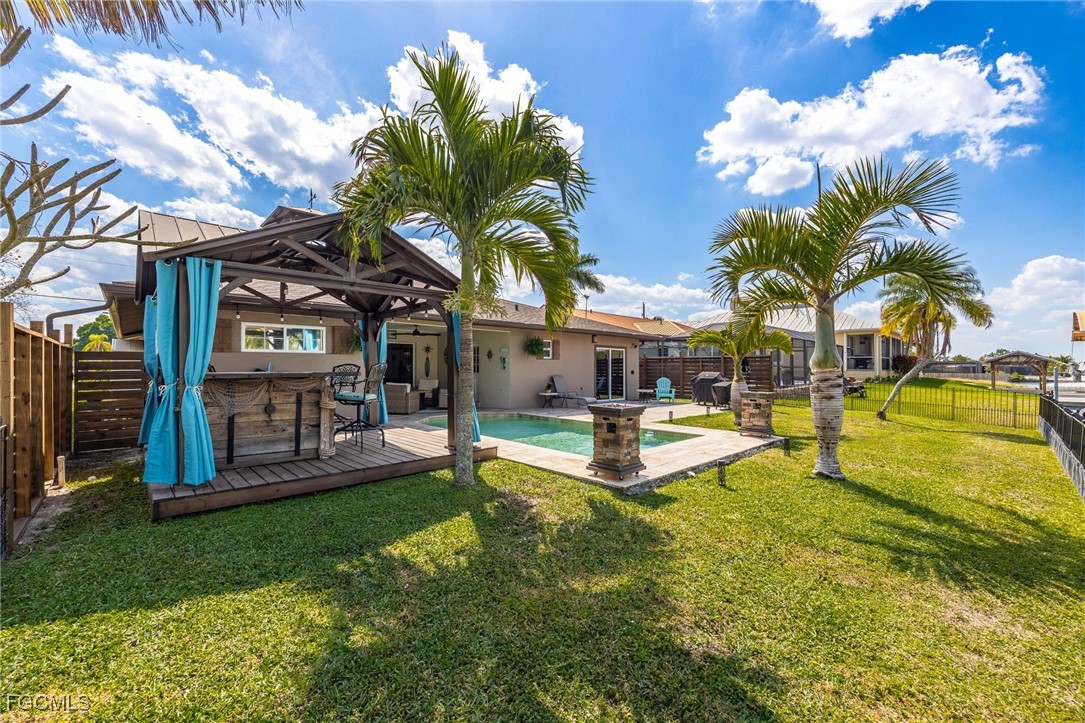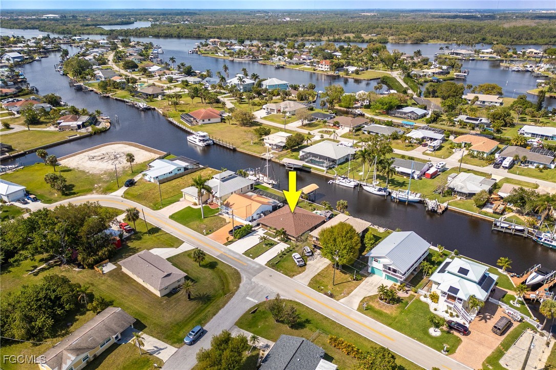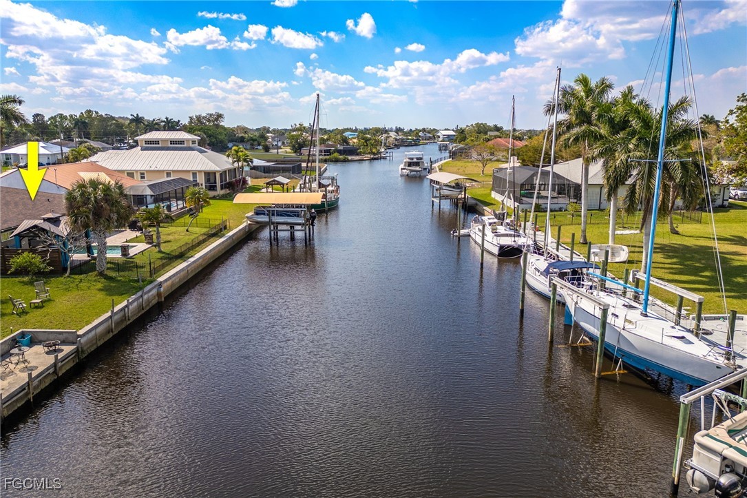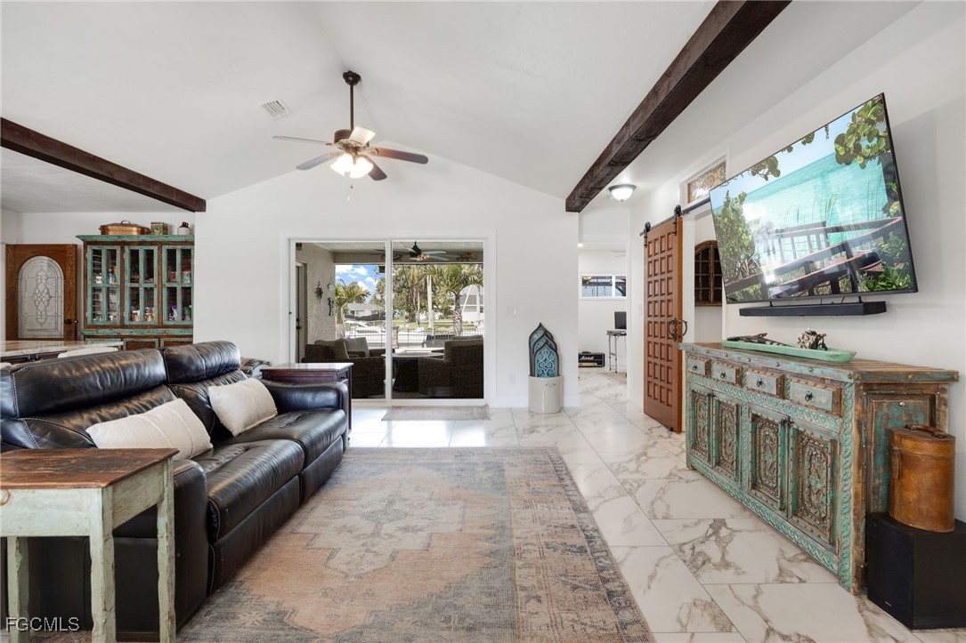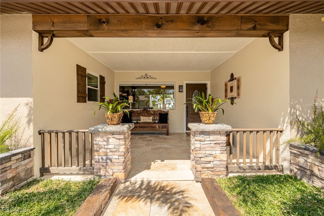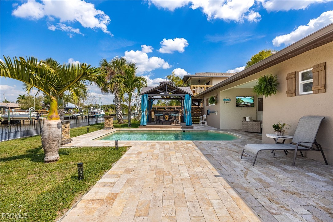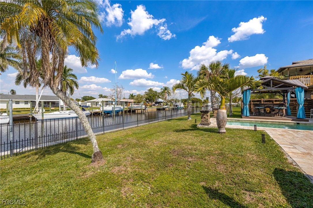 Charming & Fully Renovated Direct Access Pool Home with Tons of Character! Welcome to this beautifully updated 4 bedroom, 2 bathroom home that perfectly blends charm, elegance and modern convenience. From the moment you arrive, you'll be captivated by the great curb appeal and a cozy front porch inviting you to step inside. The spacious great room boasts a stunning cathedral ceiling with wood beams and stained glass accents, creating a warm and welcoming ambiance. Tile floors flow throughout the home enhancing both style and durability. The heart of the home is the gorgeous, upgraded kitchen, featuring wood cabinets, granite countertops, a large island, a cooktop range with an eye-catching range hood and a built-in wall oven with microwave ~ perfect for cooking and entertaining. The formal dining room is equally impressive, showcasing wooden arches with decorative glass that add a touch of sophistication. Retreat to the private primary suite, accessed through a lovely wooden door with an elegant glass insert. Inside you'll find a spacious walk-in closet and a beautifully designed en suite bathroom with direct access to the patio and pool. The home also offers three additional bedrooms and an updated guest bathroom with a stylish barn door. Step outside through the sliding glass doors to enjoy your private outdoor oasis with a covered lanai, fenced yard, sparkling pool, outdoor shower, a pergola with string lights and an awesome tiki bar! Situated on a tranquil, direct-access canal ~ just minutes to the Caloosahatchee River, this home offers a serene waterfront lifestyle. The garage features a laundry area with a front loading washer & dryer that completes this exceptional property. You will have peace of mind with a newer roof (August 2021), newer A/C system (2019), the home was replumbed, has a new electrical system, tankless water heater, newer seawall & new flood barriers. Don't miss this opportunity to own a truly one-of-a-kind home that exudes character and charm while offering modern upgrades and a fantastic outdoor space!