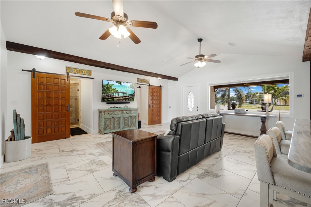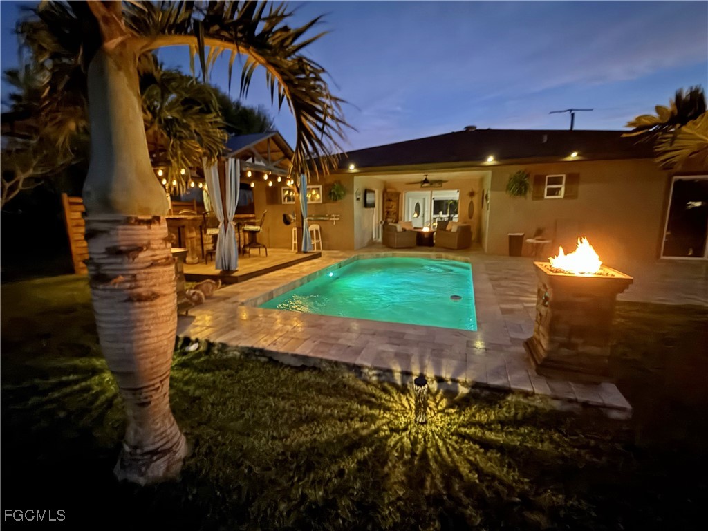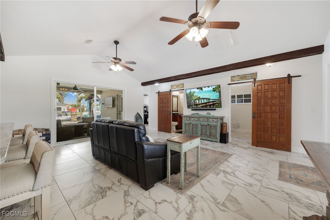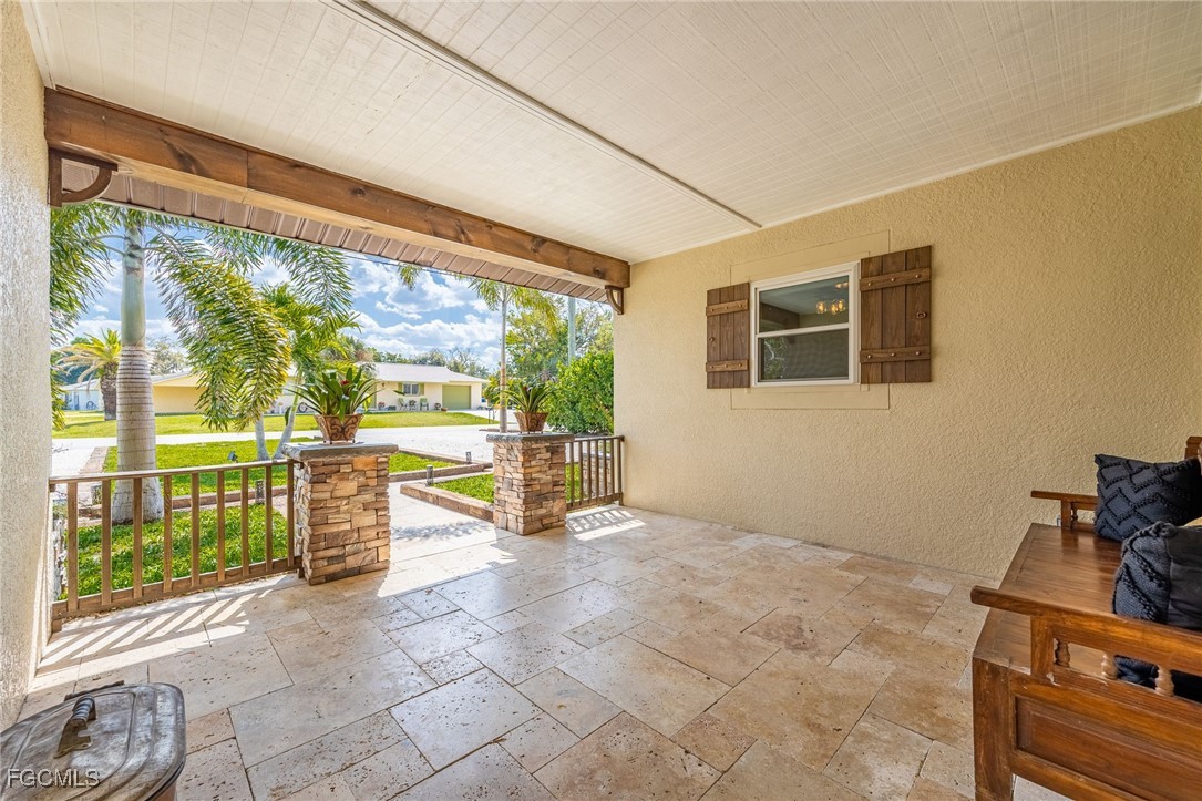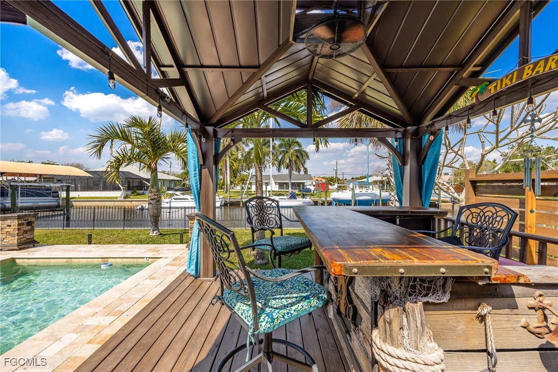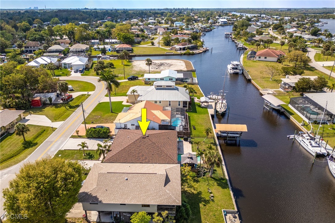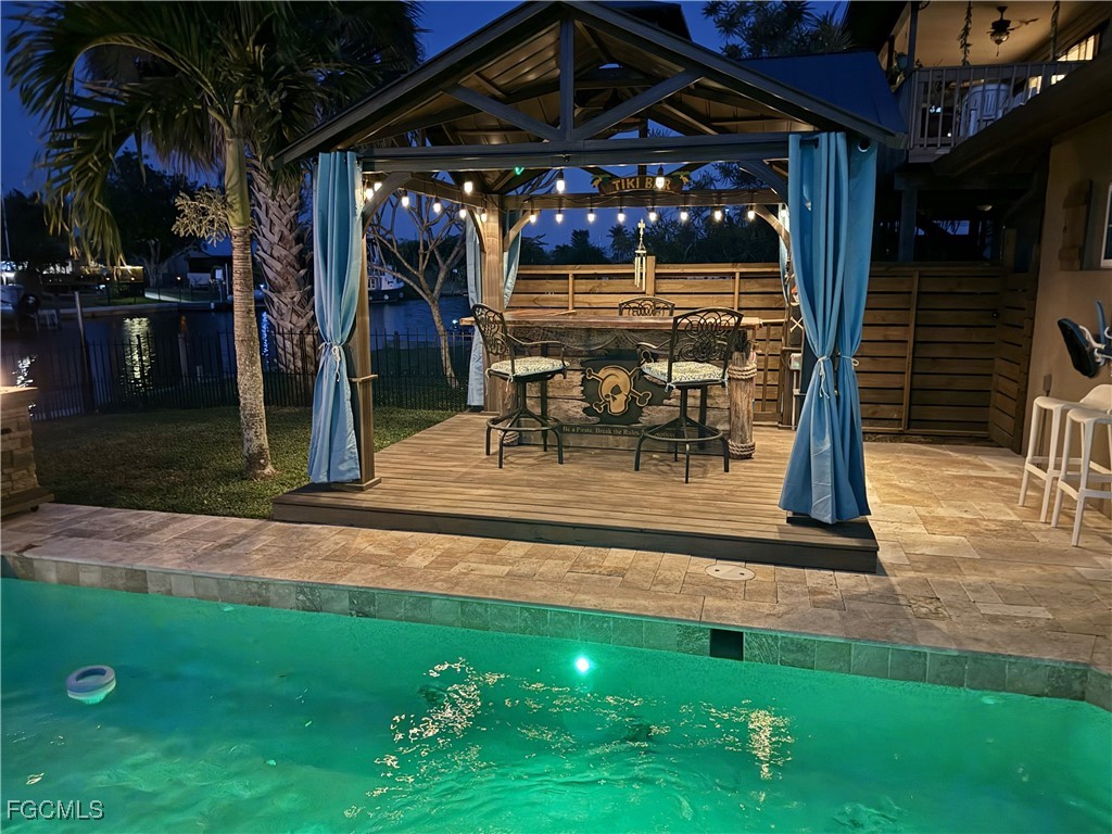 Charming & Fully Renovated Direct Access Pool Home with Tons of Character! Welcome to this beautifully updated 4 bedroom, 2 bathroom home that perfectly blends charm, elegance and modern convenience. From the moment you arrive, you'll be captivated by the great curb appeal and a cozy front porch inviting you to step inside. The spacious great room boasts a stunning cathedral ceiling with wood beams and stained glass accents, creating a warm and welcoming ambiance. Tile floors flow throughout the home enhancing both style and durability. The heart of the home is the gorgeous, upgraded kitchen, featuring wood cabinets, granite countertops, a large island, a cooktop range with an eye-catching range hood and a built-in wall oven with microwave ~ perfect for cooking and entertaining. The formal dining room is equally impressive, showcasing wooden arches with decorative glass that add a touch of sophistication. Retreat to the private primary suite, accessed through a lovely wooden door with an elegant glass insert. Inside you'll find a spacious walk-in closet and a beautifully designed en suite bathroom with direct access to the patio and pool. The home also offers three additional bedrooms and an updated guest bathroom with a stylish barn door. Step outside through the sliding glass doors to enjoy your private outdoor oasis with a covered lanai, fenced yard, sparkling pool, outdoor shower, a pergola with string lights and an awesome tiki bar! Situated on a tranquil, direct-access canal ~ just minutes to the Caloosahatchee River, this home offers a serene waterfront lifestyle. The garage features a laundry area with a front loading washer & dryer that completes this exceptional property. You will have peace of mind with a newer roof (August 2021), newer A/C system (2019), the home was replumbed, has a new electrical system, tankless water heater, newer seawall & new flood barriers. Don't miss this opportunity to own a truly one-of-a-kind home that exudes character and charm while offering modern upgrades and a fantastic outdoor space!