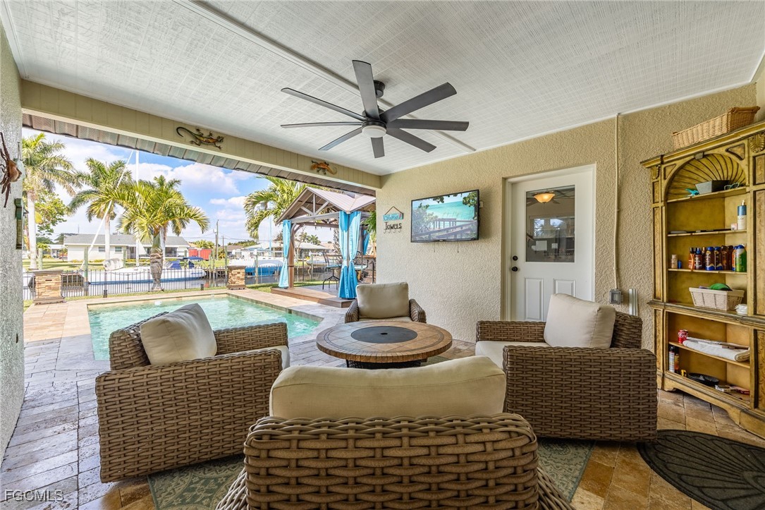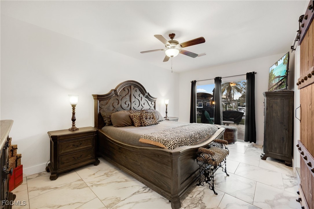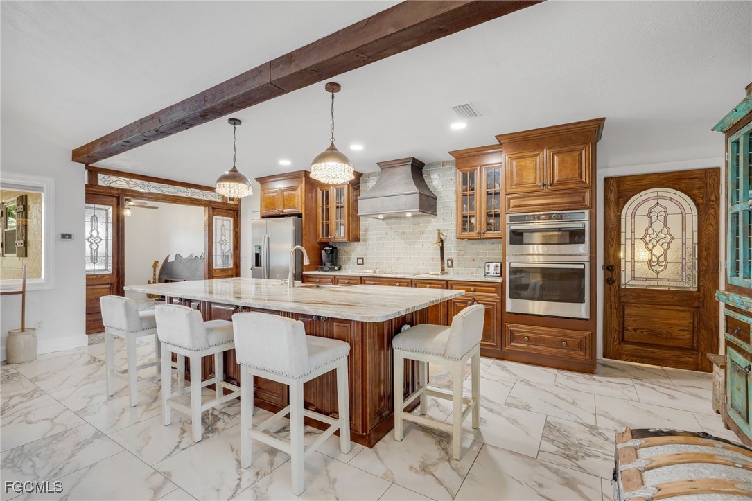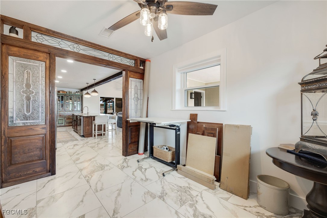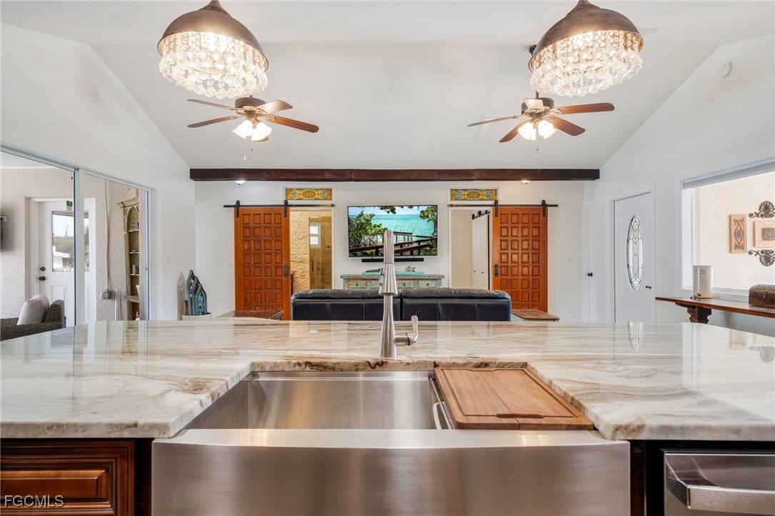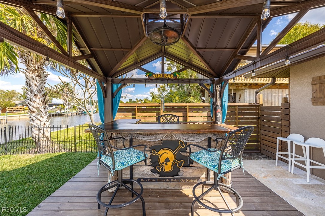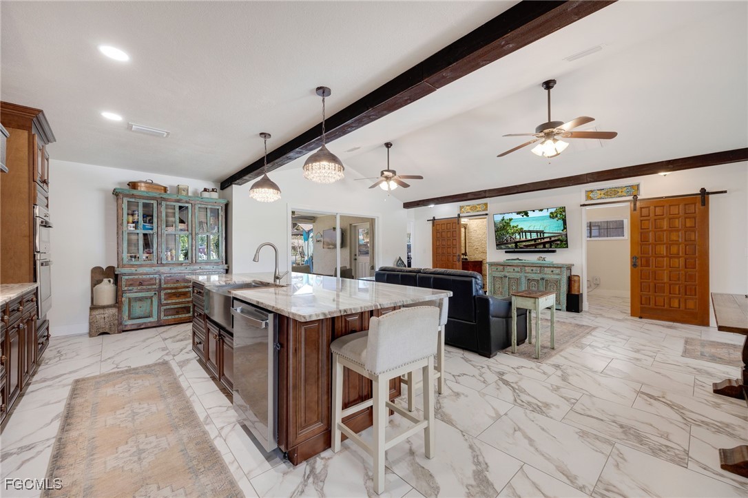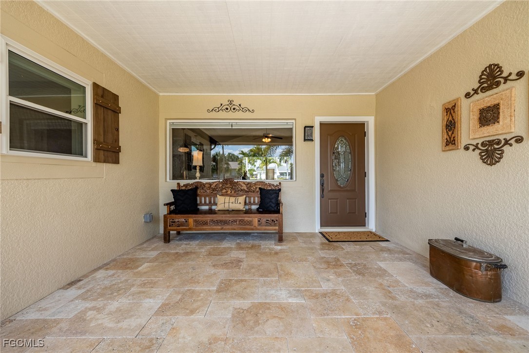 Charming & Fully Renovated Direct Access Pool Home with Tons of Character! Welcome to this beautifully updated 4 bedroom, 2 bathroom home that perfectly blends charm, elegance and modern convenience. From the moment you arrive, you'll be captivated by the great curb appeal and a cozy front porch inviting you to step inside. The spacious great room boasts a stunning cathedral ceiling with wood beams and stained glass accents, creating a warm and welcoming ambiance. Tile floors flow throughout the home enhancing both style and durability. The heart of the home is the gorgeous, upgraded kitchen, featuring wood cabinets, granite countertops, a large island, a cooktop range with an eye-catching range hood and a built-in wall oven with microwave ~ perfect for cooking and entertaining. The formal dining room is equally impressive, showcasing wooden arches with decorative glass that add a touch of sophistication. Retreat to the private primary suite, accessed through a lovely wooden door with an elegant glass insert. Inside you'll find a spacious walk-in closet and a beautifully designed en suite bathroom with direct access to the patio and pool. The home also offers three additional bedrooms and an updated guest bathroom with a stylish barn door. Step outside through the sliding glass doors to enjoy your private outdoor oasis with a covered lanai, fenced yard, sparkling pool, outdoor shower, a pergola with string lights and an awesome tiki bar! Situated on a tranquil, direct-access canal ~ just minutes to the Caloosahatchee River, this home offers a serene waterfront lifestyle. The garage features a laundry area with a front loading washer & dryer that completes this exceptional property. You will have peace of mind with a newer roof (August 2021), newer A/C system (2019), the home was replumbed, has a new electrical system, tankless water heater, newer seawall & new flood barriers. Don't miss this opportunity to own a truly one-of-a-kind home that exudes character and charm while offering modern upgrades and a fantastic outdoor space!