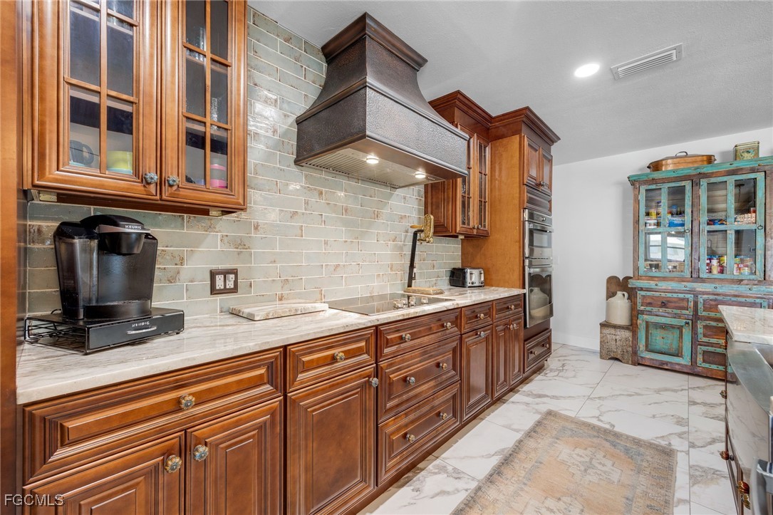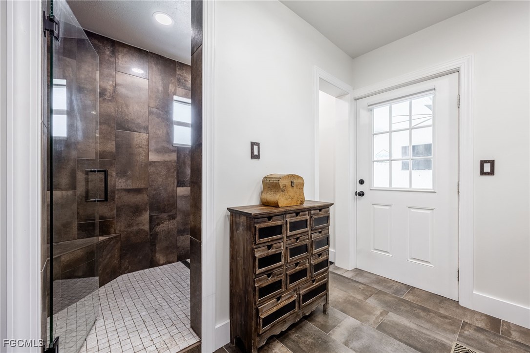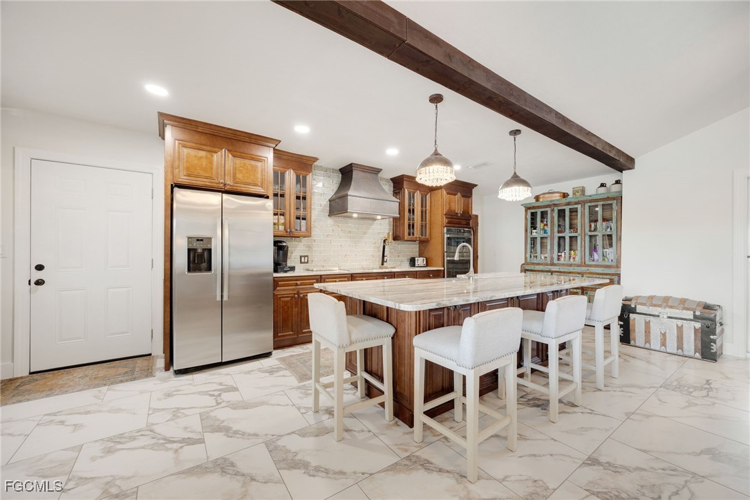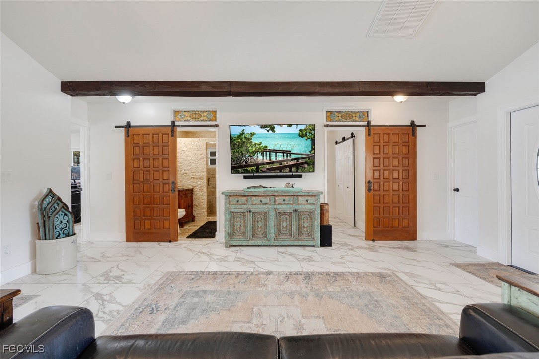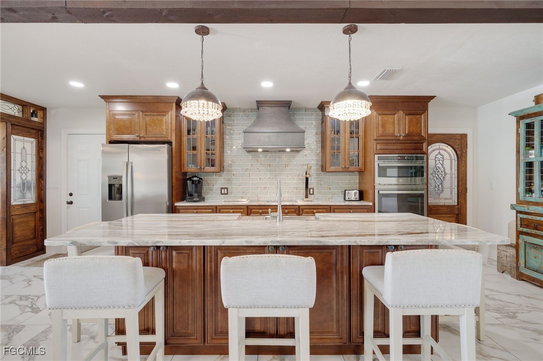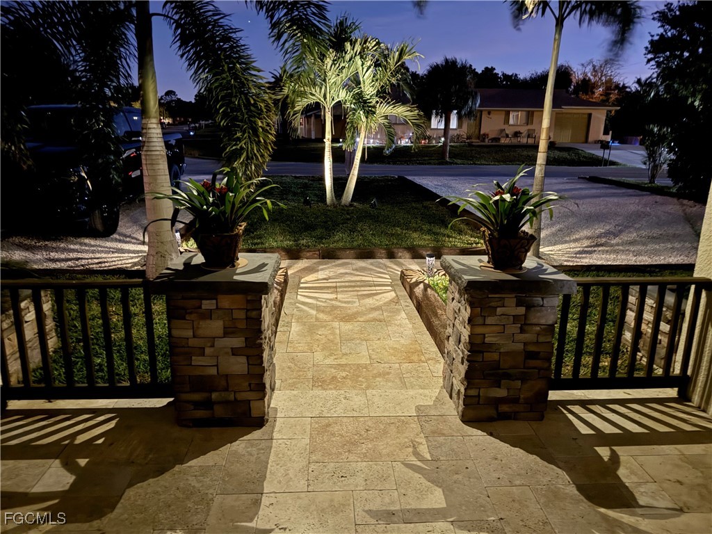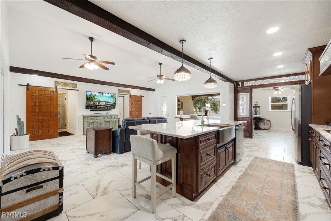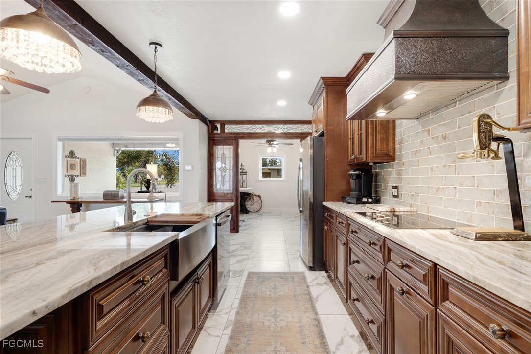 Charming & Fully Renovated Direct Access Pool Home with Tons of Character! Welcome to this beautifully updated 4 bedroom, 2 bathroom home that perfectly blends charm, elegance and modern convenience. From the moment you arrive, you'll be captivated by the great curb appeal and a cozy front porch inviting you to step inside. The spacious great room boasts a stunning cathedral ceiling with wood beams and stained glass accents, creating a warm and welcoming ambiance. Tile floors flow throughout the home enhancing both style and durability. The heart of the home is the gorgeous, upgraded kitchen, featuring wood cabinets, granite countertops, a large island, a cooktop range with an eye-catching range hood and a built-in wall oven with microwave ~ perfect for cooking and entertaining. The formal dining room is equally impressive, showcasing wooden arches with decorative glass that add a touch of sophistication. Retreat to the private primary suite, accessed through a lovely wooden door with an elegant glass insert. Inside you'll find a spacious walk-in closet and a beautifully designed en suite bathroom with direct access to the patio and pool. The home also offers three additional bedrooms and an updated guest bathroom with a stylish barn door. Step outside through the sliding glass doors to enjoy your private outdoor oasis with a covered lanai, fenced yard, sparkling pool, outdoor shower, a pergola with string lights and an awesome tiki bar! Situated on a tranquil, direct-access canal ~ just minutes to the Caloosahatchee River, this home offers a serene waterfront lifestyle. The garage features a laundry area with a front loading washer & dryer that completes this exceptional property. You will have peace of mind with a newer roof (August 2021), newer A/C system (2019), the home was replumbed, has a new electrical system, tankless water heater, newer seawall & new flood barriers. Don't miss this opportunity to own a truly one-of-a-kind home that exudes character and charm while offering modern upgrades and a fantastic outdoor space!