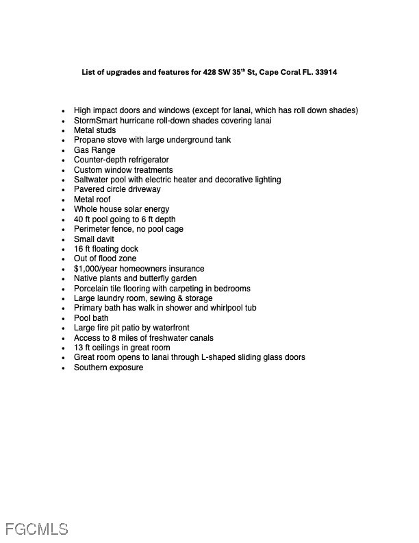 Special... There is no other way to describe this fantastic freshwater lakefront home that checks all the boxes! How about a metal roof, whole house Solar electricity with a low monthly fee to LCEC of about $25.00. This includes heating the pool. **Solar system/equipment is owned and paid in full** Also special is Southern rear exposure, a pool with a saltwater system, sunbathing shelf, oversized 40-foot length, decorative lighting, paver surround and electric heater. More features include a buried propane gas tank for the gas range, a large laundry/craft room, 13-foot ceilings, impact glass on windows and electric/manual roll down shutters on L-shaped sliding glass doors. The roll down shutters have separate screen panels that can be lowered to screen the lanai in while sliders are open. How about a whole house water treatment system? Check that box too. Primary bedroom and bath are off to one side of the home with 3 Guest bedrooms on the other. Primary bathroom has a jetted tub and a large walk/roll in shower. The property is in unit 45, steps from Pelican Elementary and conveniently situated between Veterans Pkwy and Cape Coral Pkwy, close to grocery stores and restaurants. Home has a paver circle driveway. Waterfront is on freshwater Mohave Lake with access to 8 miles of canals and other lakes that can be explored with your small boat or kayak. Home has a seawall with a small davit, a 16-foot floating dock and a pavered lakefront patio with firepit. Rear exposure is to the south and you'll witness some awesome sunsets and sunrises depending on the time of year. This home is not in a flood zone and does not require flood insurance. This property was not damaged by any of the recent storms, including Ian. Homeowner's, Wind and Hazard Insurance premiums are currently under $1,200/year. This property has a fenced back yard and features a lot of native plants, a butterfly garden and landscaping with custom irrigation, some with drip features to save on water. This home features top quality window treatments. This concrete block home was built in 2016 and features metal studs in the interior walls. Owners have priced this to sell. Schedule a showing appointment to see this special home soon and make it YOUR Special Home!