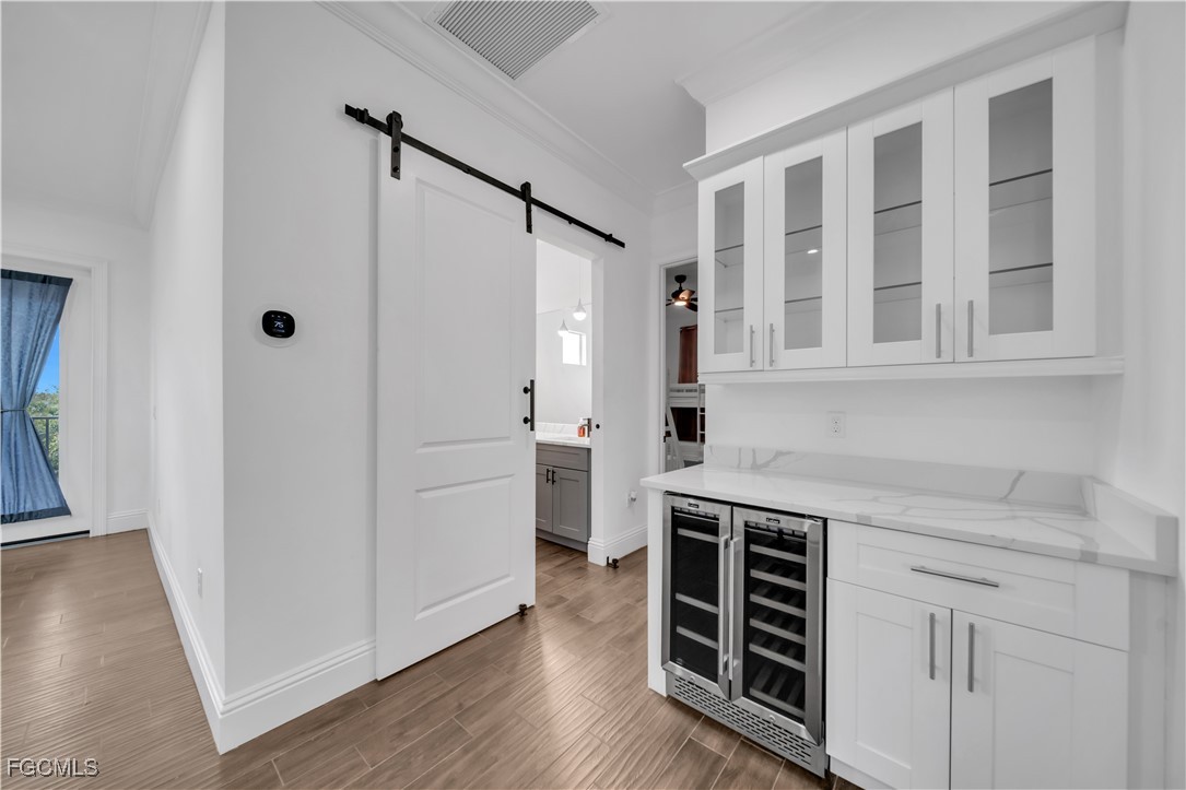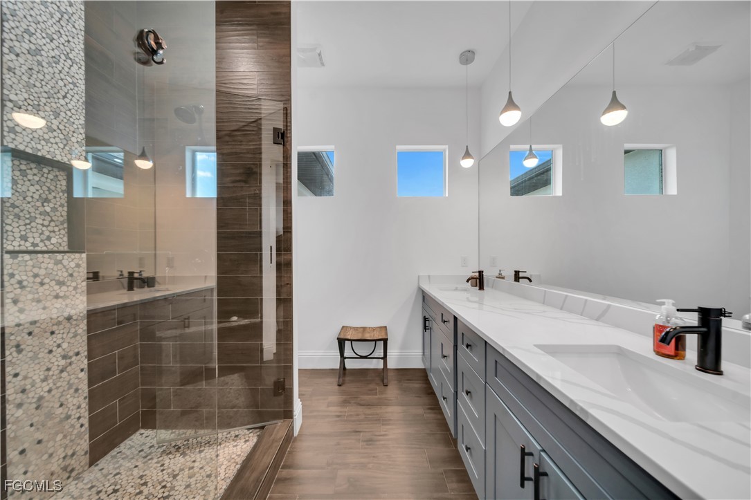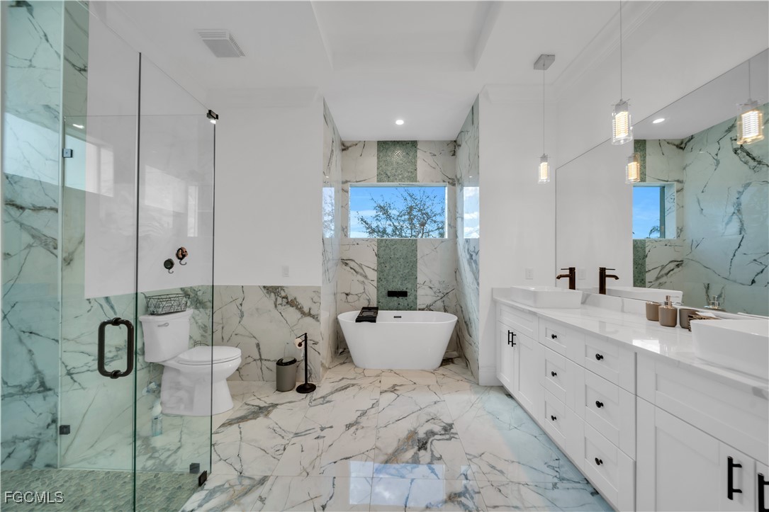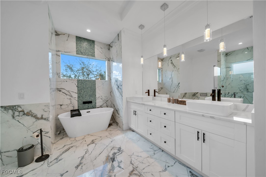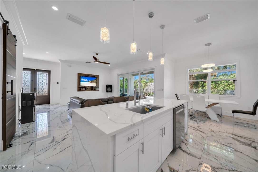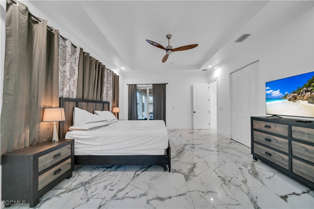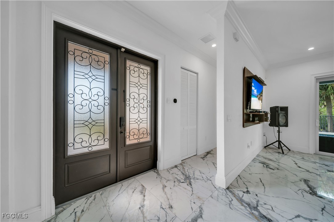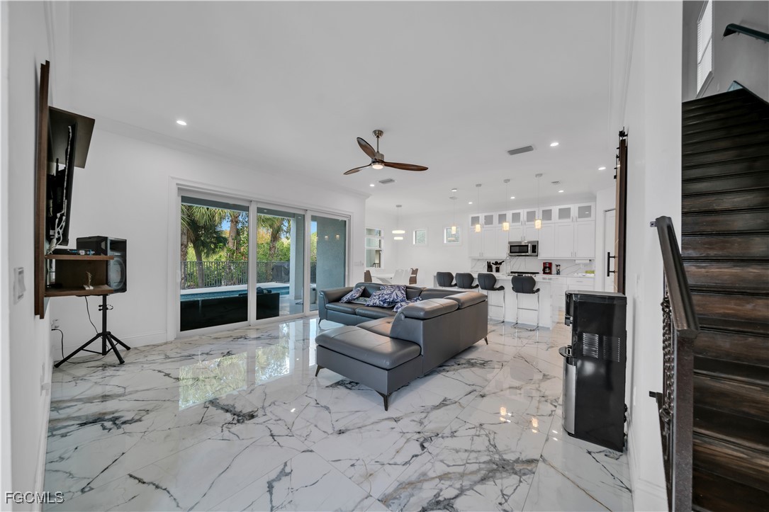 This 3 Bedroom , 2.5 bath custom-built home offers exceptional craftsmanship and attention to detail throughout and is located in the desirable Waterway Cove subdivision of North Fort Myers. The first floor features soaring ceilings and elegant Italian marble flooring. The kitchen is thoughtfully designed with soft-close white cabinetry, a smart charging station, and a striking marble waterfall island.
